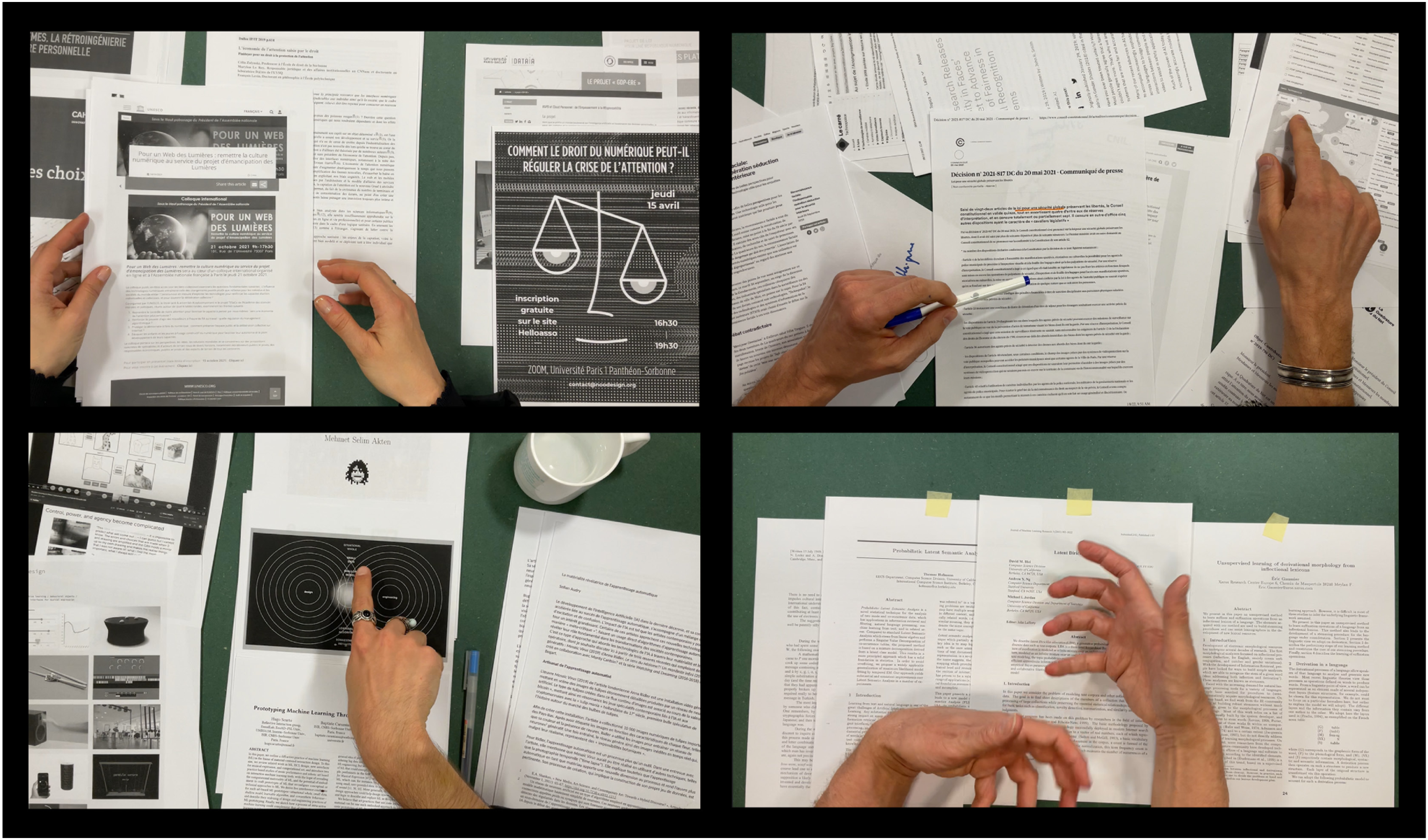 Screenshots from 4 different video recordings, where we see the co-inquirers using (grouping, pointing, sorting out, discarding) the documents they picked from the wall of documents.