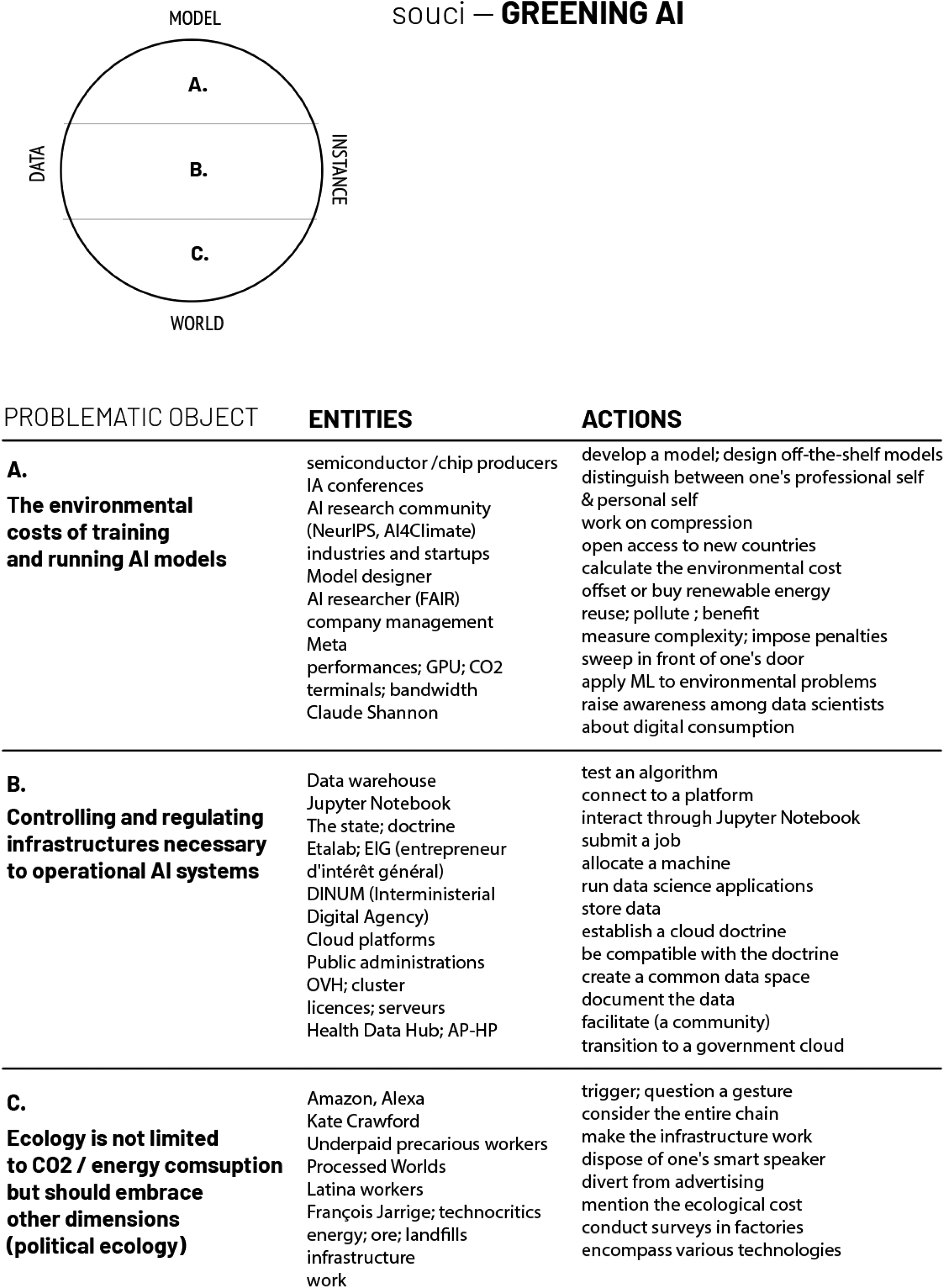 This representation echoes a framework proposed and used by institutions like the OECD (OECD Framework for the classification of AI systems, 2022; Tabassi, 2023). Here, it does not serve as a descriptive model, but as a heuristic tool to represent in a shared space a plurality of situations, practices and operations through which AI is realised and circulates. As part of our accounting