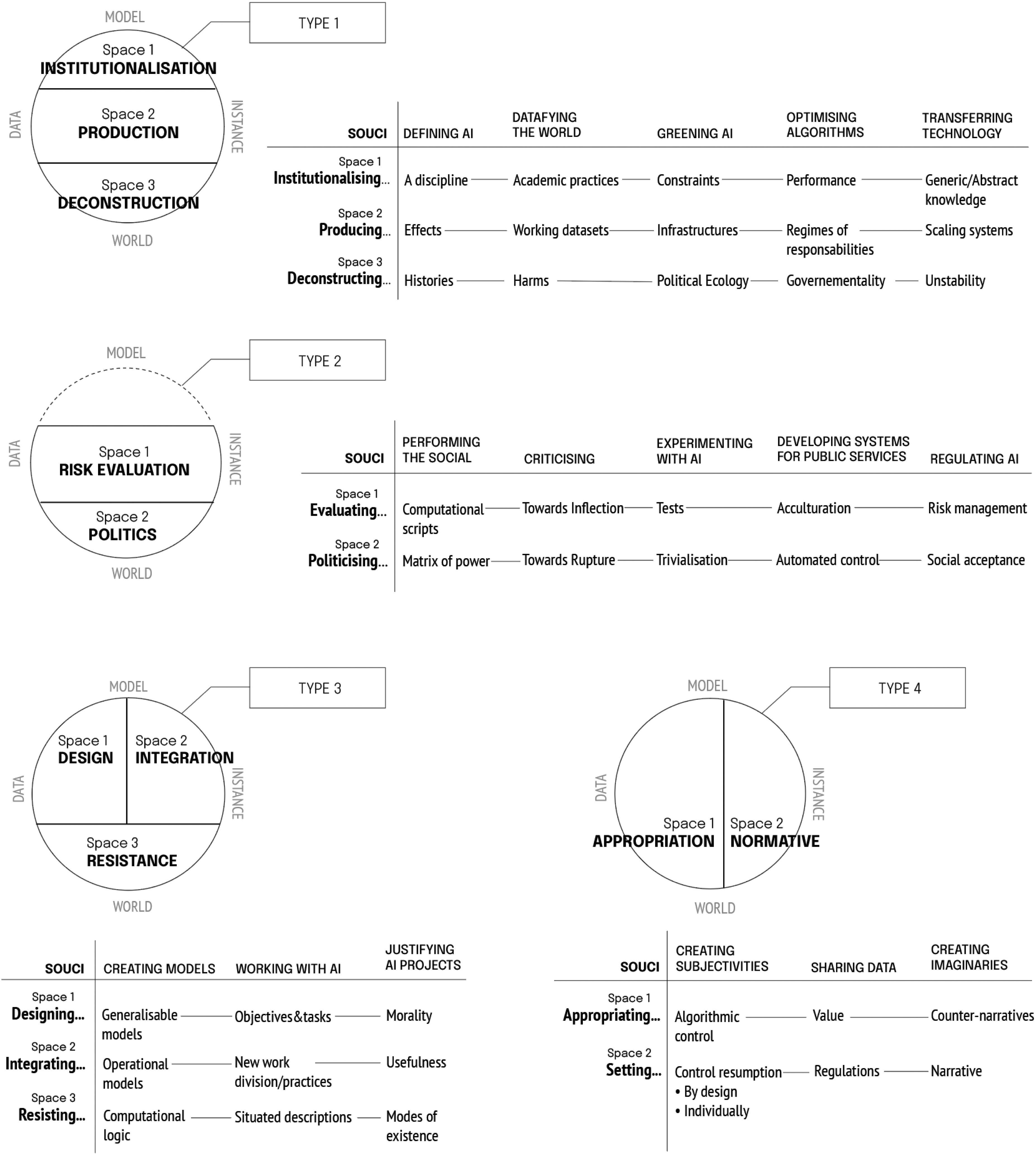 These genres, largely controlled by big-tech and media players, grant existence to particular entities and arrangements and perform AI both as a global issue (AI monolith) and as specific configurations (AI situations). Each genre develops its own agency and puts in motion different operations (Figure 3): A