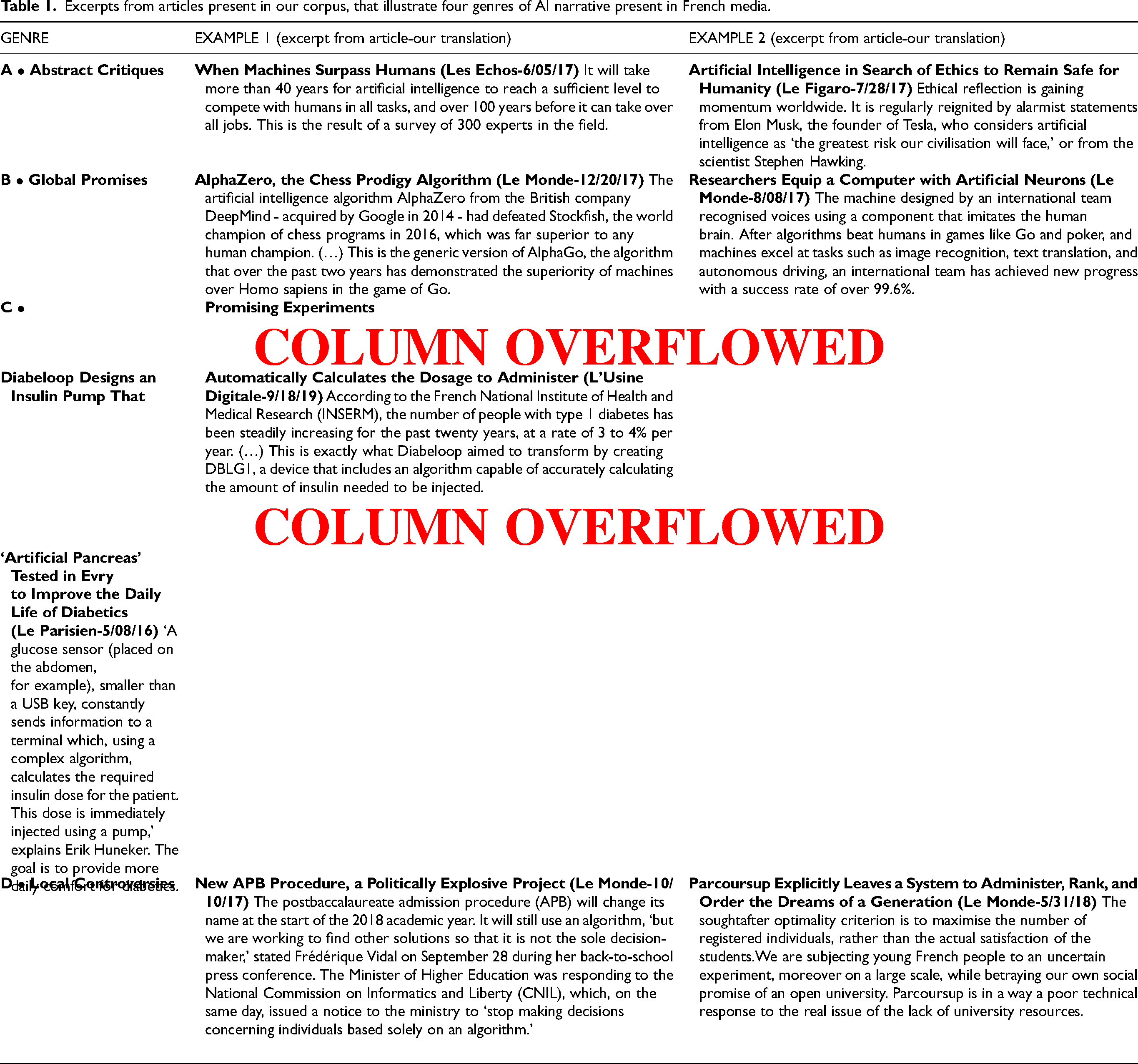 Excerpts from articles present in our corpus, that illustrate four genres of AI narrative present in French media.