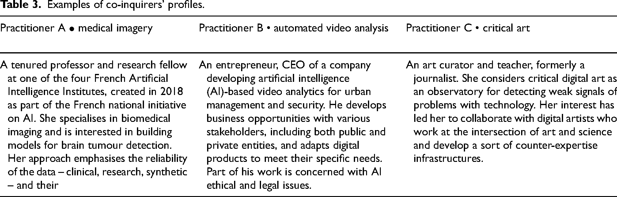 We reached out to a total of 56 individuals, out of which 25 (19 men and 6 women) eventually engaged in the research process, as anchor points to ground, historicise and re-problematise AI. The co-inquirers’ practices, all related to AI, are characterised by a striking degree of heterogeneity, e.g. reporting on the digitalisation of public services or pushing it, creating deep learning models applied to sound, building a community of AI developers, optimising AI models to reduce their environmental impacts, or studying regulations of AI (Table 3 details three of their profiles).