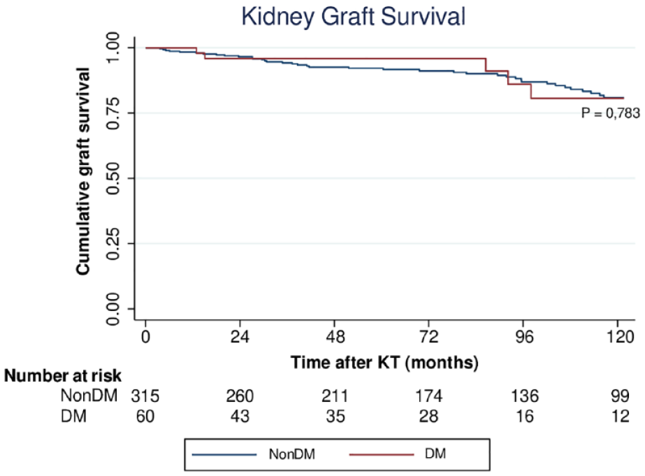 In multivariate analysis, the predictors of all-cause mortality were DM, recipient age, delayed graft function, and donor age. These results confirm diabetes as an independent risk factor for mortality in this population. This is explained by the cardiovascular risk that diabetes confers by presenting endothelial damage, cellular dysfunction, increased oxidation, mitochondrial dysfunction, neurohormonal activation with increased fibrosis, and cardiomyocyte hypertrophy. 43