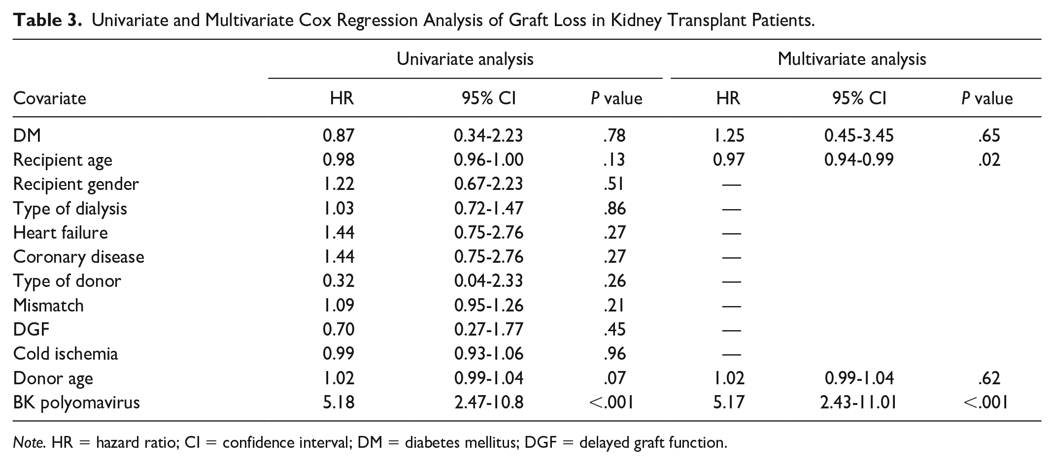 Univariate and Multivariate Cox Regression Analysis of Graft Loss in Kidney Transplant Patients.