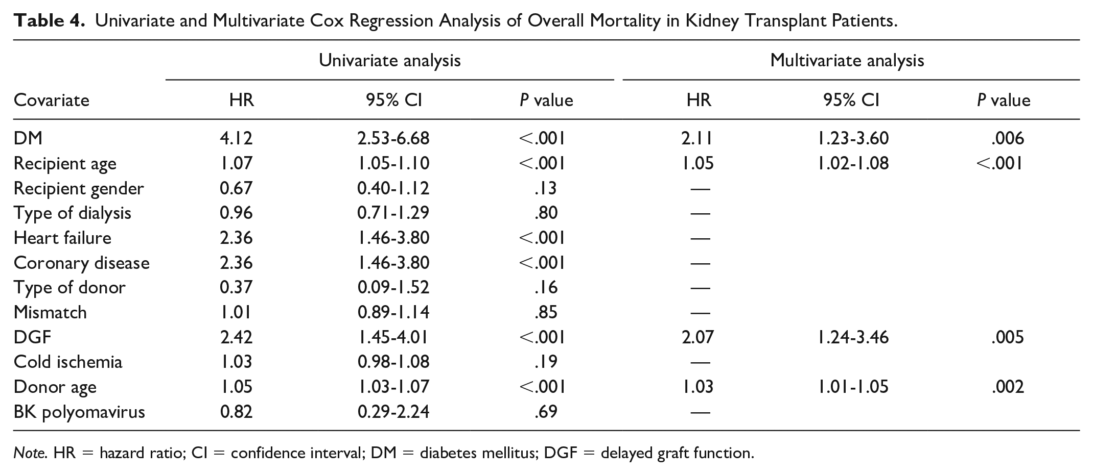 Univariate and Multivariate Cox Regression Analysis of Overall Mortality in Kidney Transplant Patients.