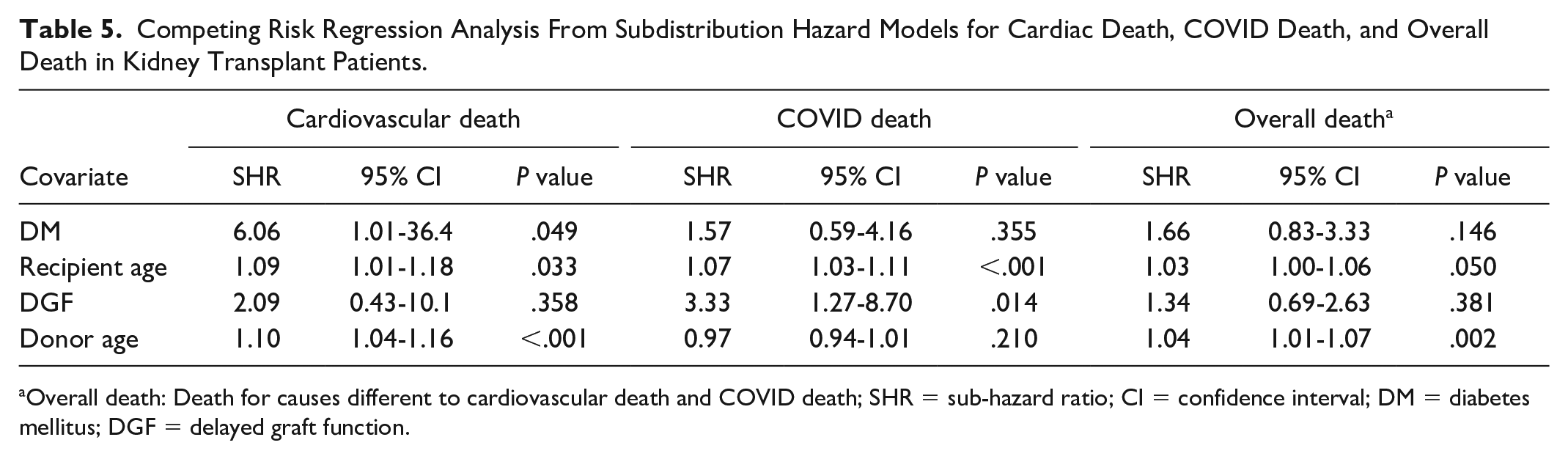 Overall death: Death for causes different to cardiovascular death and COVID death; SHR = sub-hazard ratio; CI = confidence interval; DM = diabetes mellitus; DGF = delayed graft function.