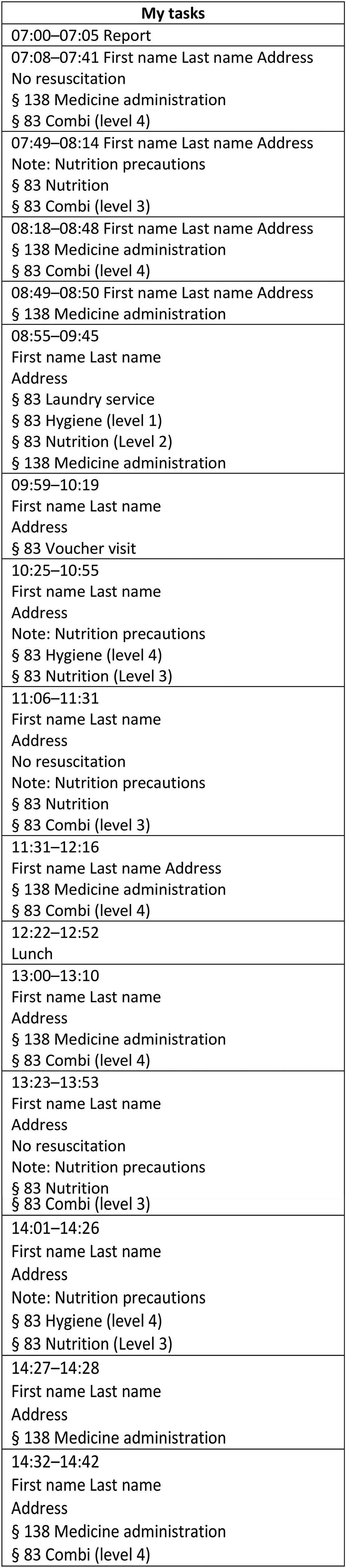 When the HCPs logged into the EHR on their different devices, the timetable was the first information presented to them. On a tablet, the timetable was supplied with information on team tasks and correspondence from GPs or the hospital. This information was not available on mobile phones. The headline on both devices was ‘My tasks’. The timetable was generated on the basis of the planner's work in the planning module of the EHR. The planners received the allocation of the service from the care assessor level and did the actual planning for a team of geographically organised HCPs. Timeslots on the timetable were allocated by planners, and the HCPs could not alter this but could make the visits in another order. Below, we illustrated a segment of a timetable from home care, which would normally run from 7.00 to 15.00. Figure 3 is an example of a timetable, inspired by field studies.