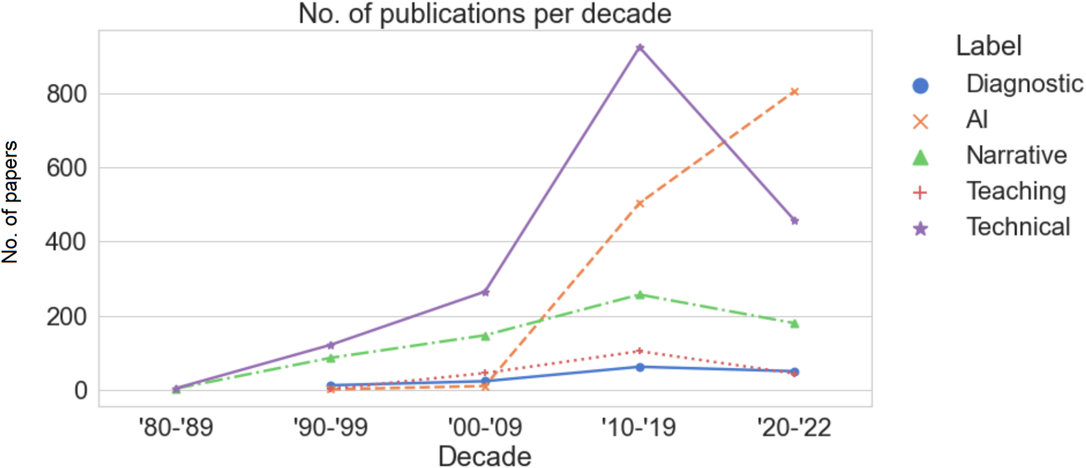 Temporal analysis (Figure 5) shows an overall increasing trend over five decades in the number of papers in each category. Specifically, “technical” papers witnessed a relatively sharp increase in the 2010s, while “AI” papers soared only in recent years.