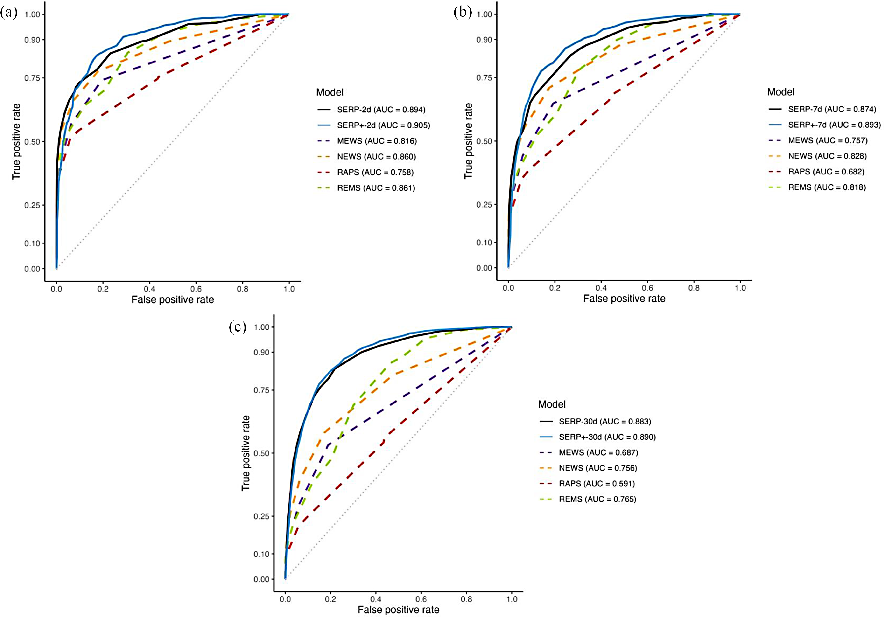 SERP+-2d, SERP+-7d, and SERP+-30d were evaluated on the 2019 and 2020 test sets to predict two-day, seven-day, and 30-day mortality outcomes. SERP-2d, SERP-7d, and SERP-30d were calculated for each record in the 2019 and 2020 test sets by mapping the value of each predictor variable to the points assigned by the SERP scoring table. The performance of SERP scores was evaluated for the prediction of two-day, seven-day, and 30-day mortalities. Additionally, we assessed the performance of MEWS, 37 NEWS, 38 Rapid Acute Physiology Score (RAPS), 39 and Rapid Emergency Medicine Score (REMS) 40 on both test sets to facilitate comparison of SERP+ and SERP with other commonly used triage scores.