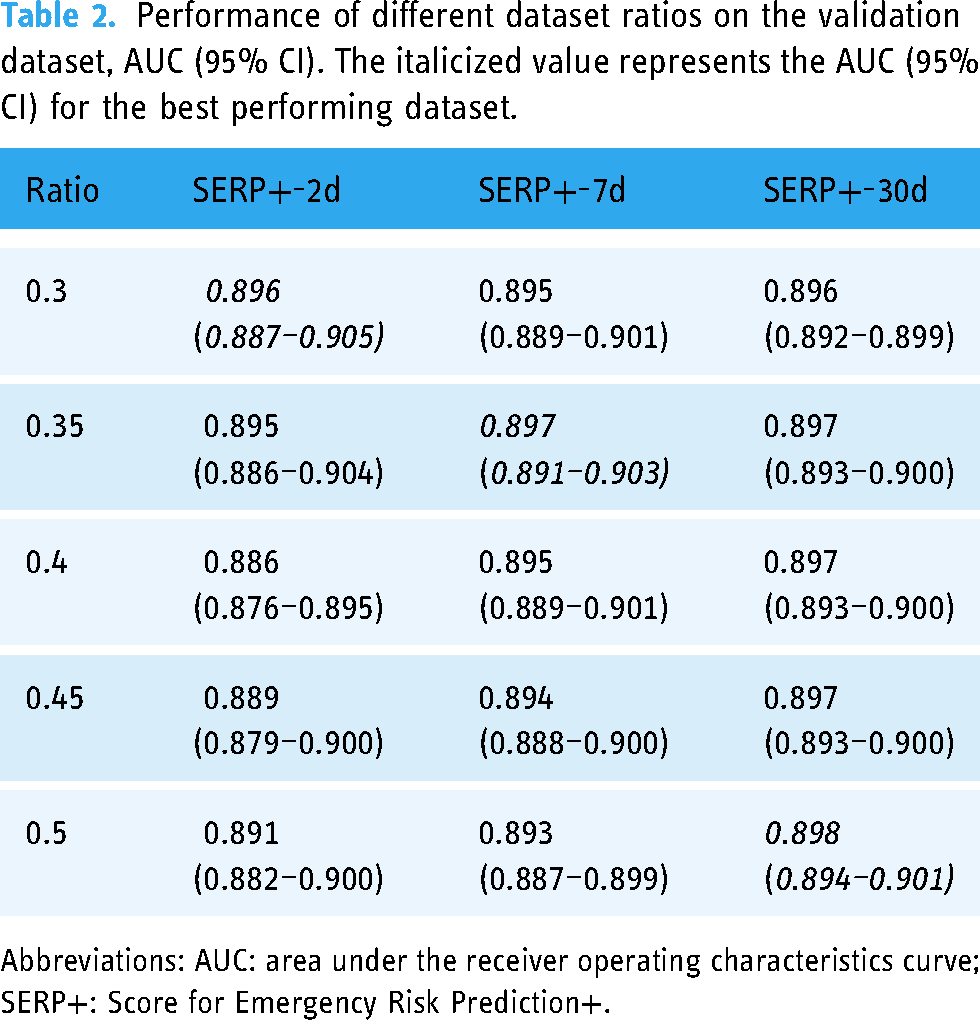 SERP+-2d, SERP+-7d, and SERP+-30d were developed using the AutoScore-Imbalance framework. 26 Following the systematic steps in this framework, model training was completed on the training dataset, and a hold-out validation approach was used by using an independent validation set for parameter tuning. In Block A of the AutoScore-Imbalance framework, 26 the raw imbalanced training dataset was first modified to produce a relatively balanced dataset. From the original dataset, five additional datasets were generated using random oversampling and random undersampling at ratios of 0.3, 0.35, 0.4, 0.45, and 0.5. The ratio represents the proportion of minority class samples relative to the entire dataset. For example, a ratio of 0.3 implies that 30% of the dataset has the minority class label. We used these five datasets to generate five sets of preliminary SERP+ scores and then evaluated the performance of these scores on the validation dataset by calculating the AUC on mortality outcomes. The dataset which produced the best performing score was chosen for the final score derivation. This systematic approach enabled us to choose the ratio that achieved an optimal balance between addressing class imbalance and preventing overfitting. Scoring for the original minority samples remains reliable, as the chosen ratio was validated based on its performance on the independent validation set.