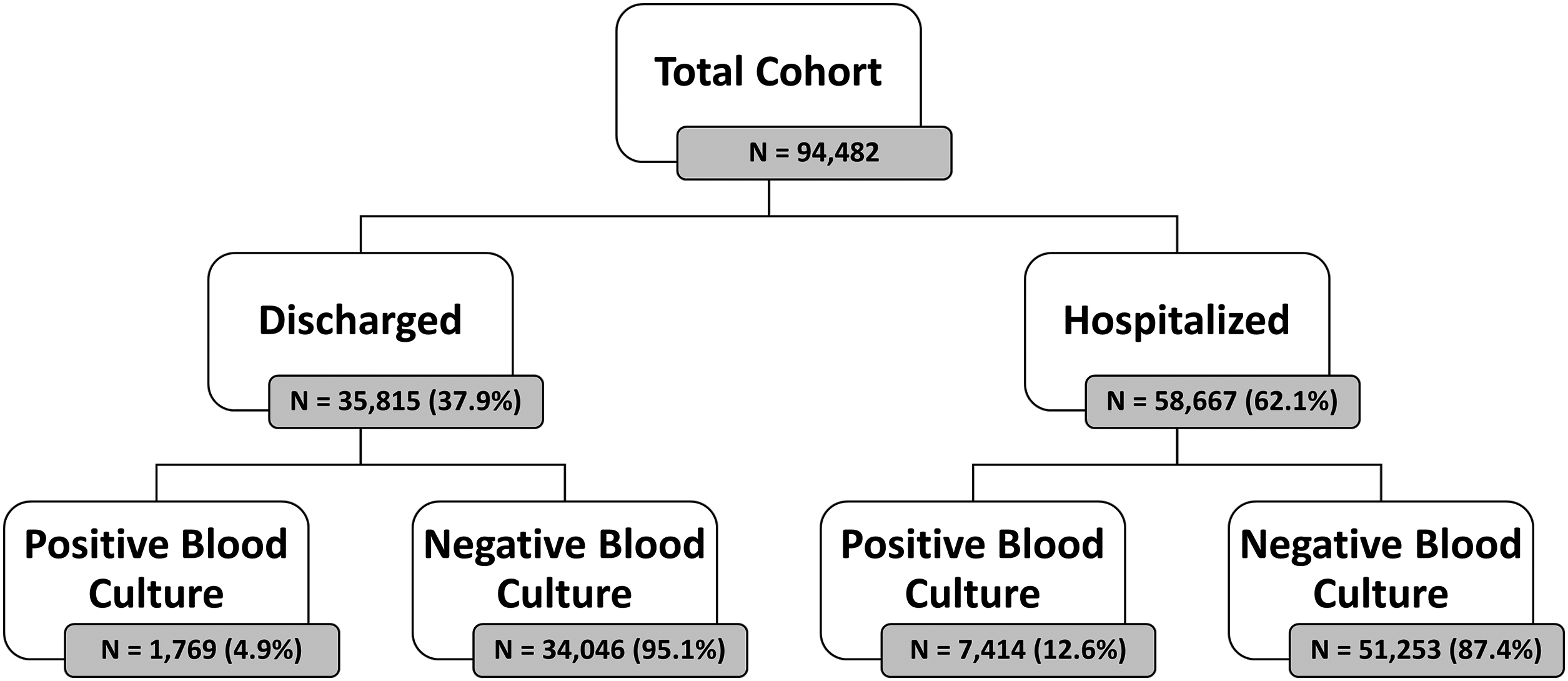 Blood cultures were taken from these patients to assess for bacteremia, identifying 7414 hospitalizations (12.6%) and 1769 discharged cases (4.9%) with positive blood cultures. The study cohort comprised 94,482 individuals, of whom 52% were males. Of the whole cohort 38% (35,815) were discharged from the ED after initial workup. Of the discharged patients, 1769 were later confirmed positive for BSI, accounting for 19.2% of this subgroup. When considering the entire cohort, the prevalence of bacteremia was 9.7%, reflecting the significant impact of this condition on the emergency healthcare landscape. Figure 1 shows the CONSORT flow of patients in our cohort.