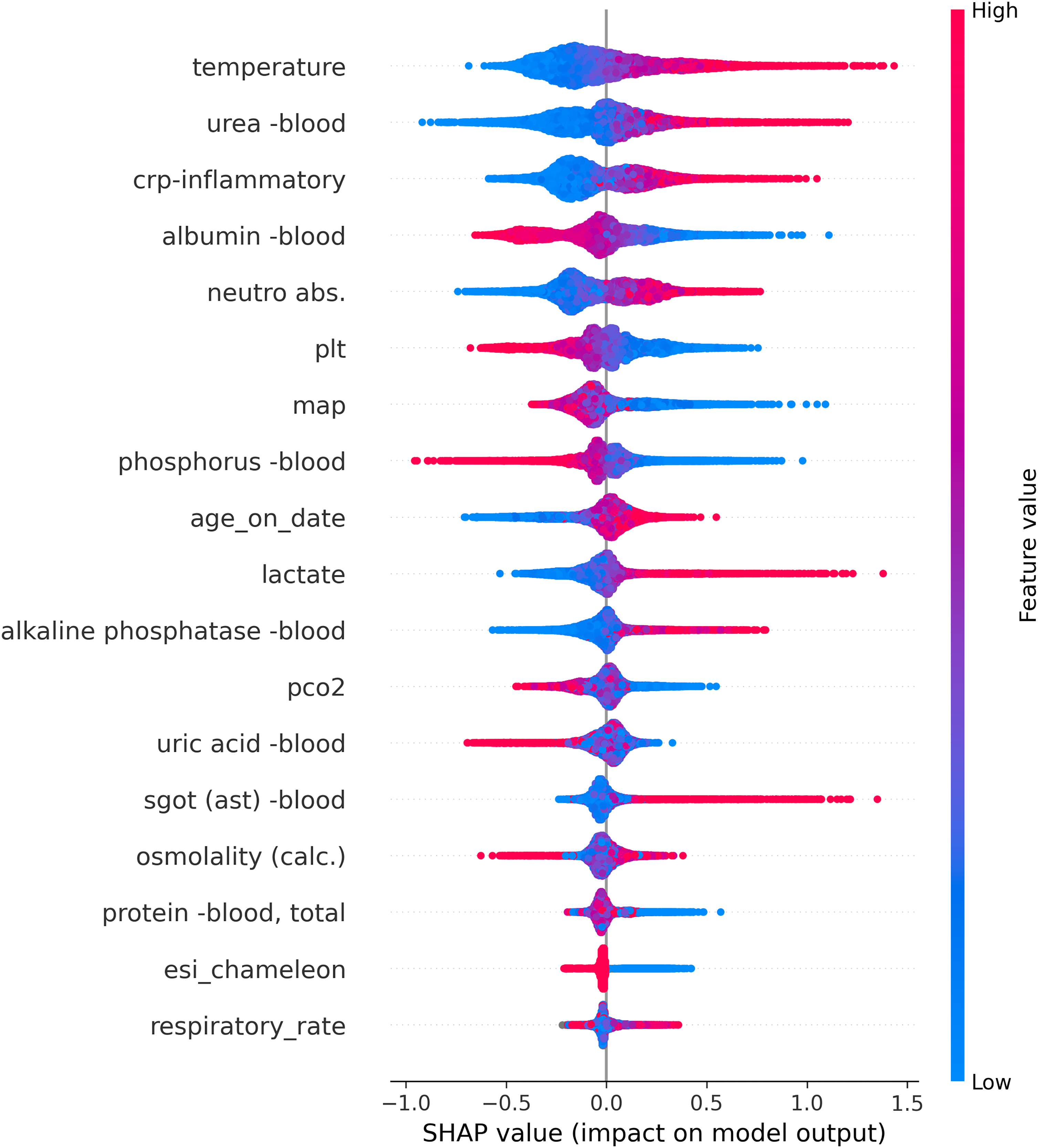 The impact of each one of the features on the final model output is presented in Figure 2, using a Shapley additive explanations (SHAP) plot. SHAP is a method to explain the feature importance of machine learning models. It is based on the concept of shapely value in game theory (named after Lloyd Shapley who first described it in 1951 10 ). The shapely value is the solution to a problem where a group of players play a game and get a certain result. The values are the relative contribution of each player to the result. The meaning of “additive explanations” is that the explanation is made by running the model while adding features one at a time until the result is reached. This contrasts with other explanation models, for example, models which run all the possible feature combinations and compare them to the result. The features are ordered according to their ranking importance, from top to bottom, regarding their contribution to the raw probability of blood cultures coming back positive. The horizontal spread pattern represents the impact degree on the final model probability (SHAP value). The horizontal location represents the direction each value affects the final model probability—dots located on the right of the plot increase the probability of the model's prediction for positive BSI, and dots located on the left decrease the probability of its prediction. Red dots represent high parameter value, while blue dots represent low values.