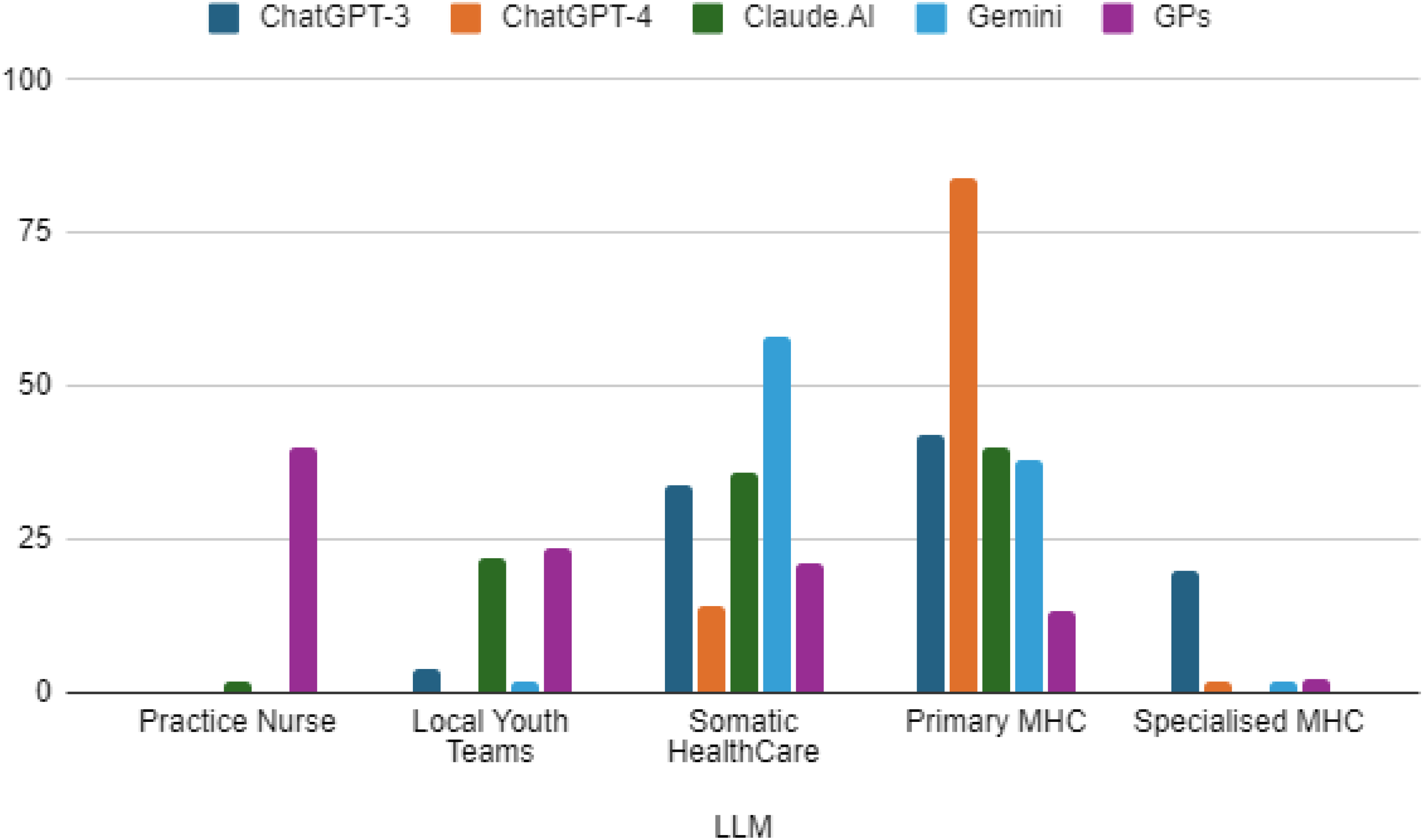 The comparison between the four AI tools and the GPs regarding where they would refer a child with a profile similar to the one in the vignette elicited interesting observations (Figure 3). The majority of the GPs responded that they would recommend treating the child in general practice (nurse practitioner = 40%). The AI tools, in contrast, did not recommend treating the child in general practice, except for Claude.AI in one case. Instead, the AI tools recommended referring the child to primary MHC or somatic healthcare. Claude.AI. recommended referring the child to local youth teams more frequently than the other AI tools, whereas ChatGPT-3 recommended referring the child to specialized MHCs more frequently than the other AI tools (Table 4).