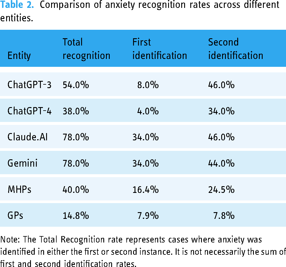The statistical methodology used in this study was designed to provide a rigorous assessment of the effectiveness of various AI tools and human professionals in recognizing anxiety. We calculated three types of recognition rates for anxiety: (1) First Recognition Rate: The percentage of cases where anxiety was identified as the primary concern. (2) Second Recognition Rate: The percentage of cases where anxiety was identified as a secondary concern. (3) Total Recognition Rate: The percentage of cases where anxiety was identified in either the first or second instance. This rate represents the overall ability to recognize anxiety, regardless of whether it was identified as the primary or secondary concern. The first RQ was examined using Chi-squared test of independence to assess whether the differences in total recognition, first identification, and second identification rates across these entities were statistically significant. Due to the multiple comparisons involved in comparing each pair of entities, Bonferroni correction method was used. The second RQ was explored using a Chi-squared test of independence to determine whether the likelihood of recognizing anxiety varied among the different evaluators, taking the multiple vignettes into account as repeated measures. The third RQ was analyzed descriptively by comparing the percentage of referrals to different healthcare services by each entity, highlighting differences in their approach to managing anxiety. The fourth RQ was analyzed descriptively by comparing the treatment recommendations for mental and behavioral disorders across AI tools and GPs. This approach quantified the differences in recommendation patterns, highlighting the potential for integrating AI into clinical decision-making.
