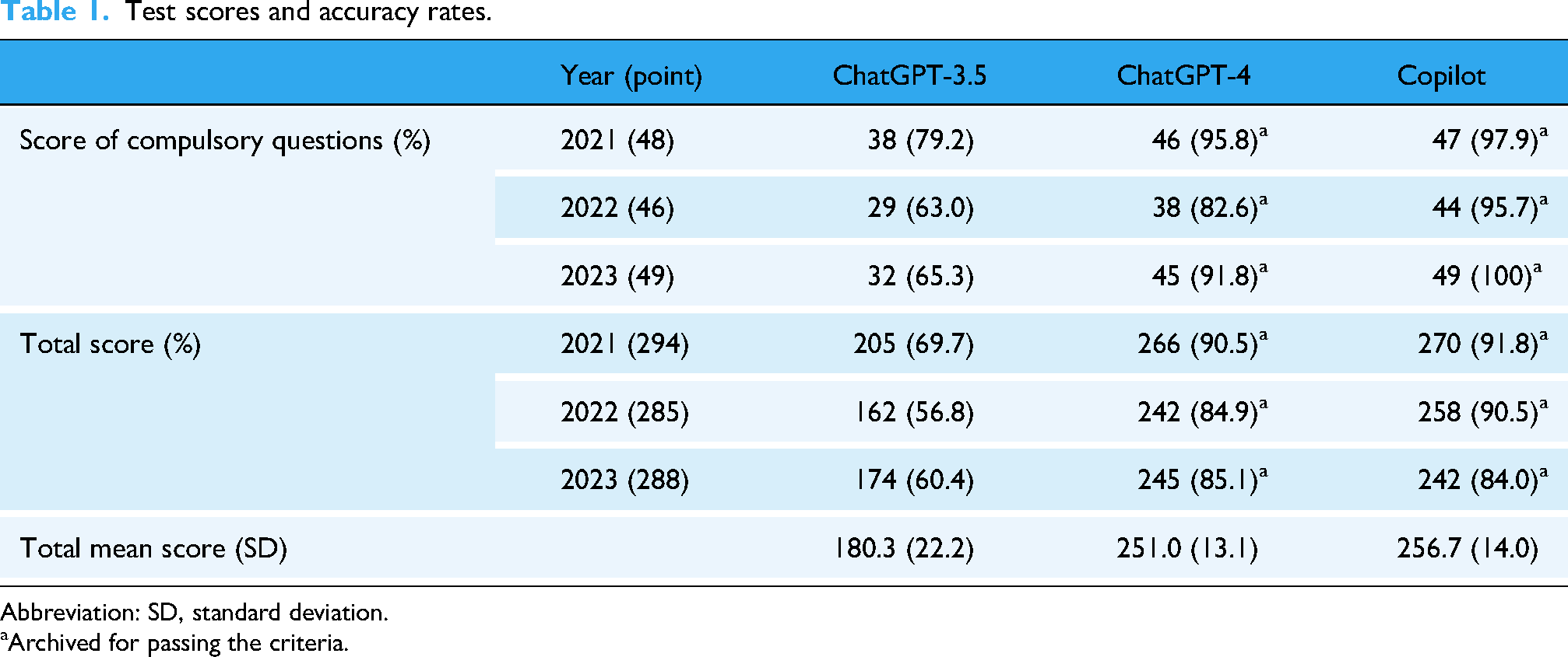 In addition, the accuracy rate of Microsoft Copilot is similar to that of ChatGPT-4. This study revealed that ChatGPT-4 and Microsoft Copilot had sufficient performance to pass the Japanese nursing license examination, and the average total score over 3 years did not show statistical significance. A previous study showed that Microsoft Copilot had the same performance as ChatGPT-4,