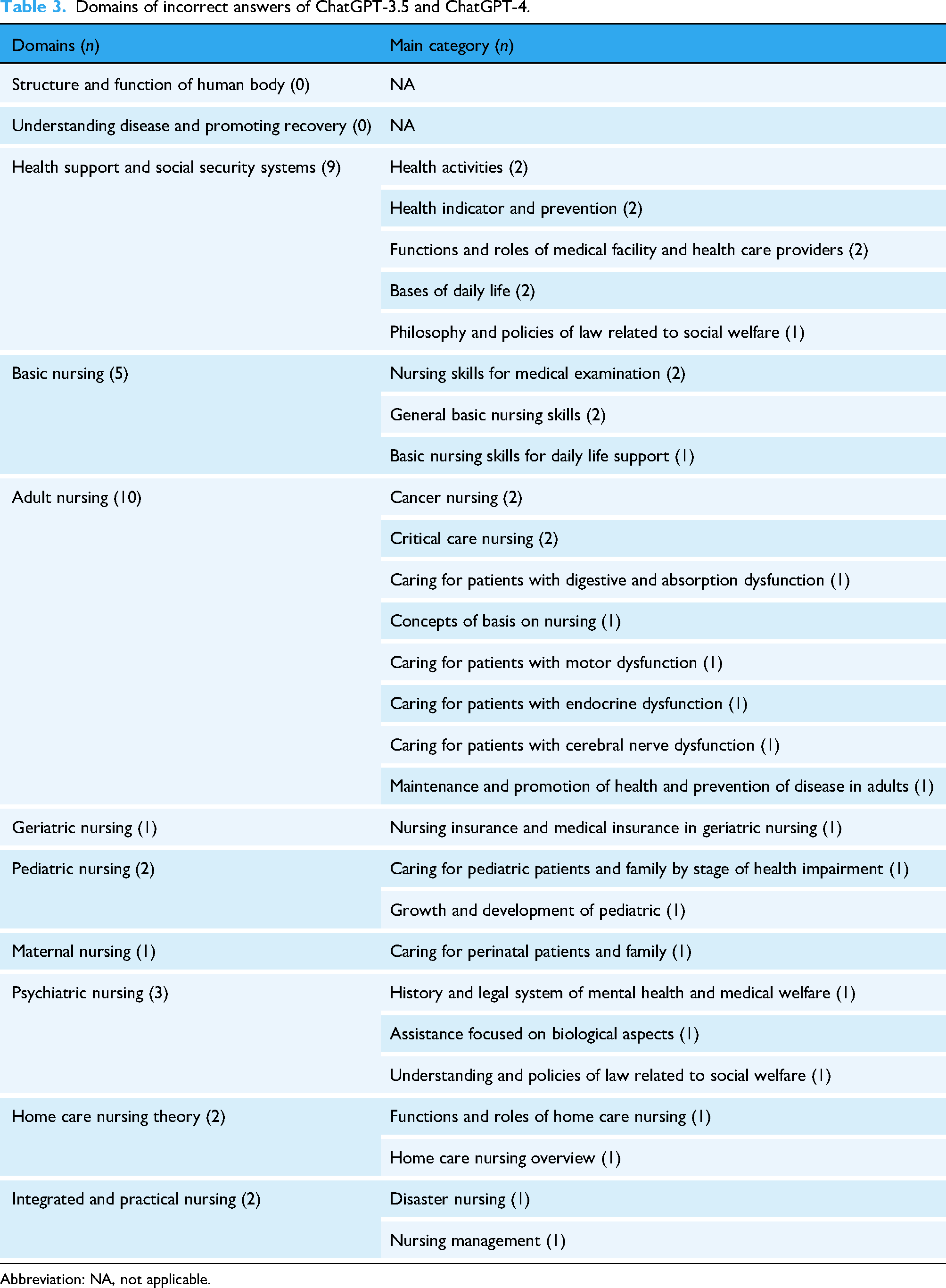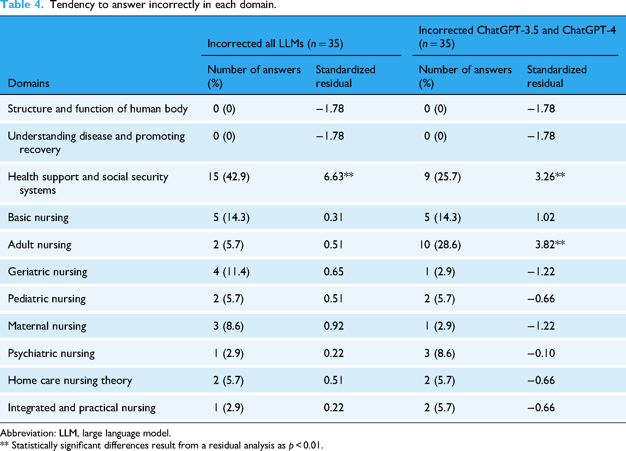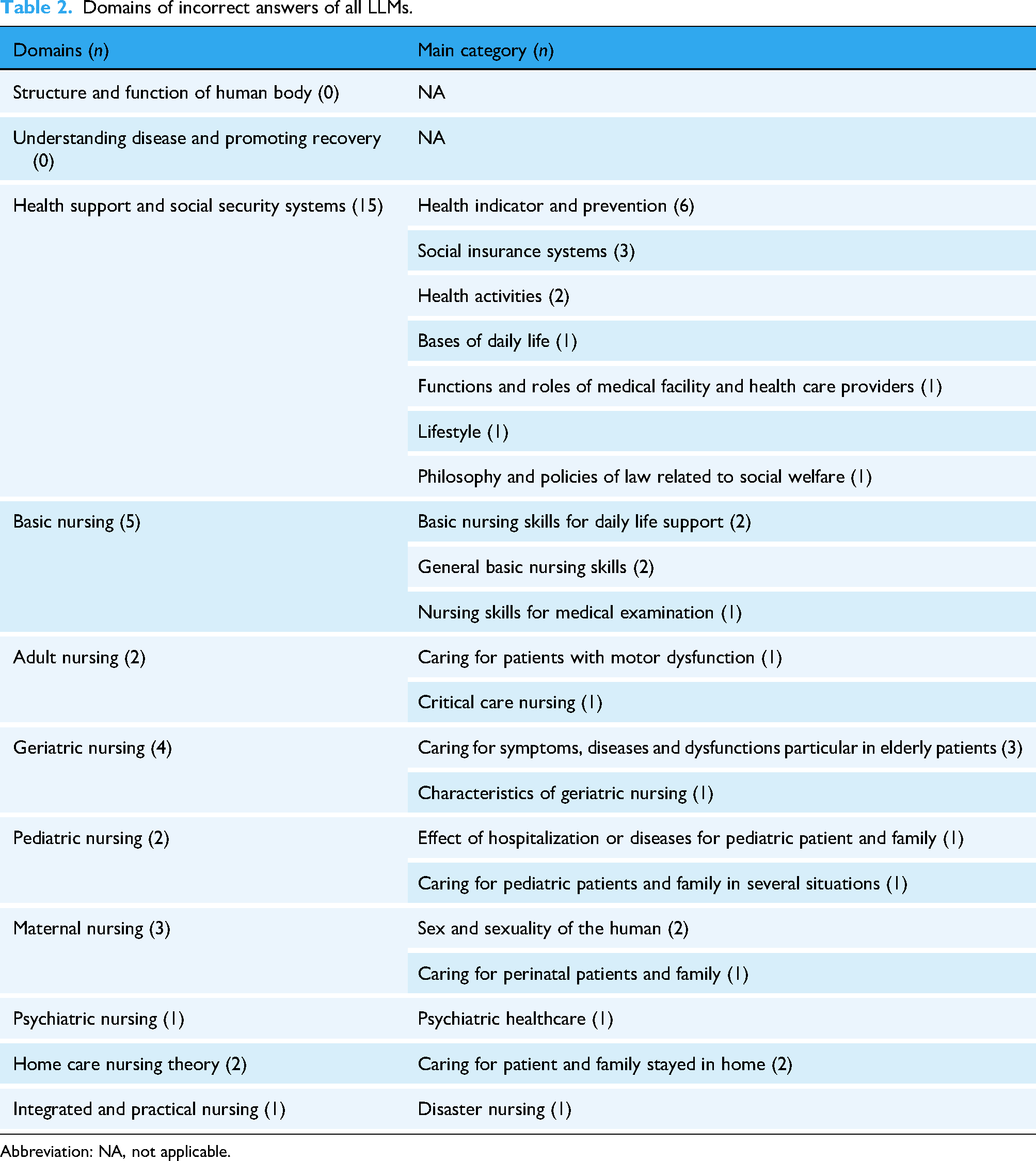 LLMs may perform well with basic knowledge in medical settings. However, it is generally said that LLMs are incomplete and may sometimes answer incorrectly. 17 In a previous study, LLMs did not pass license examinations with complete answers, indicating that LLMs are incomplete; the error types of LLMs were examined in relation to medical knowledge. 18 However, it is unclear in which domains LLMs tend to incorrectly provide nursing knowledge. Understanding the domains to which LLMs tend to answer incorrectly is important for the effective use of LLMs by healthcare providers, particularly nurses.