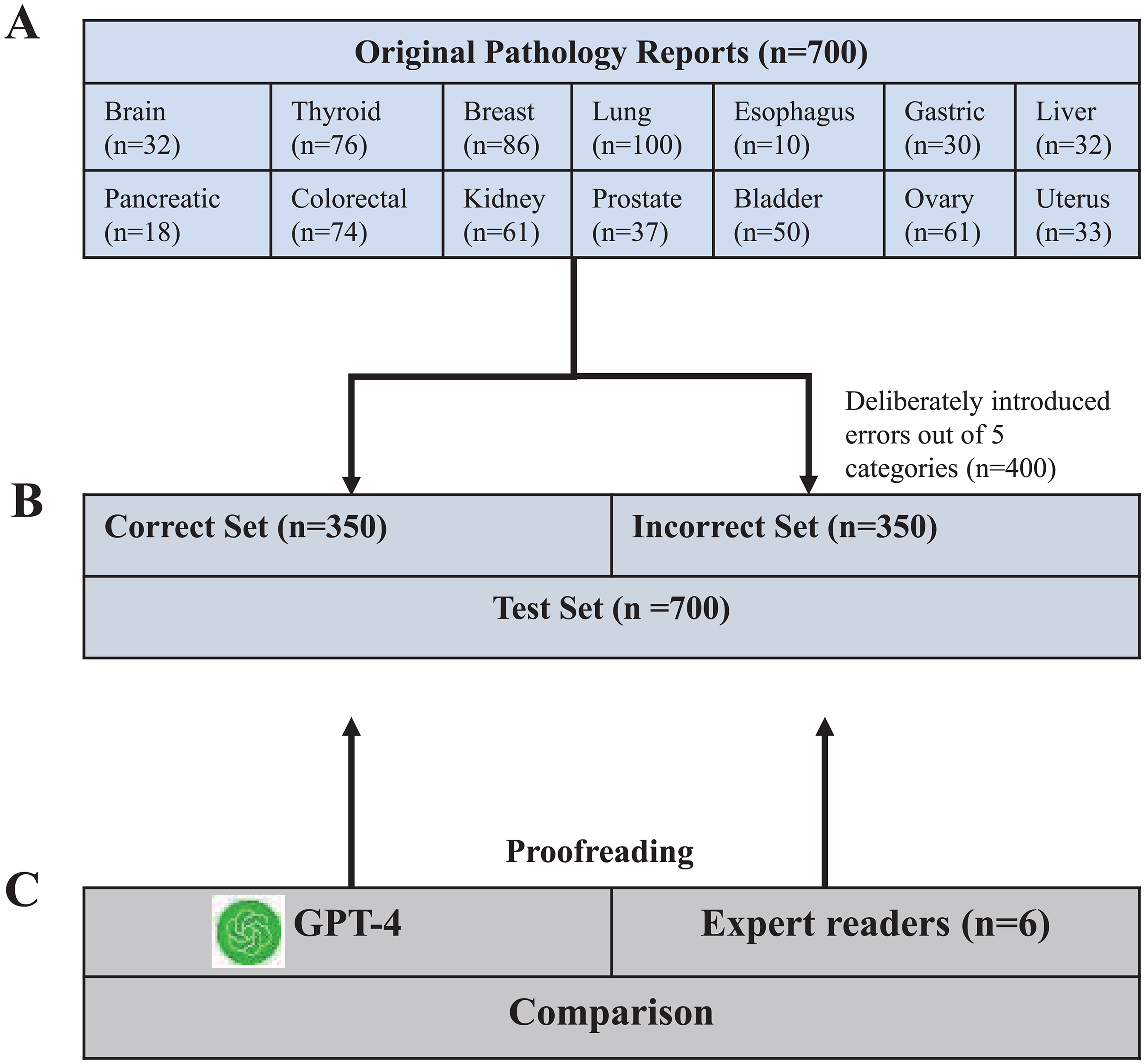 Study flowchart. (A) Initially, 700 original pathology reports from 14 organs were selected. (B) These were then randomized into two sets: a correct set and an incorrect set, each containing 350 pathology reports. Within the incorrect set, 400 errors across five categories (Clerical errors, Improper use of terminology, Missing information, explain or diagnose errors, Data inconsistency) were deliberately introduced, with a maximum of three errors per case. (C) GPT-4 and six doctors were tasked with evaluating each pathology report to identify potential errors, allowing for a comparative analysis of their performance.