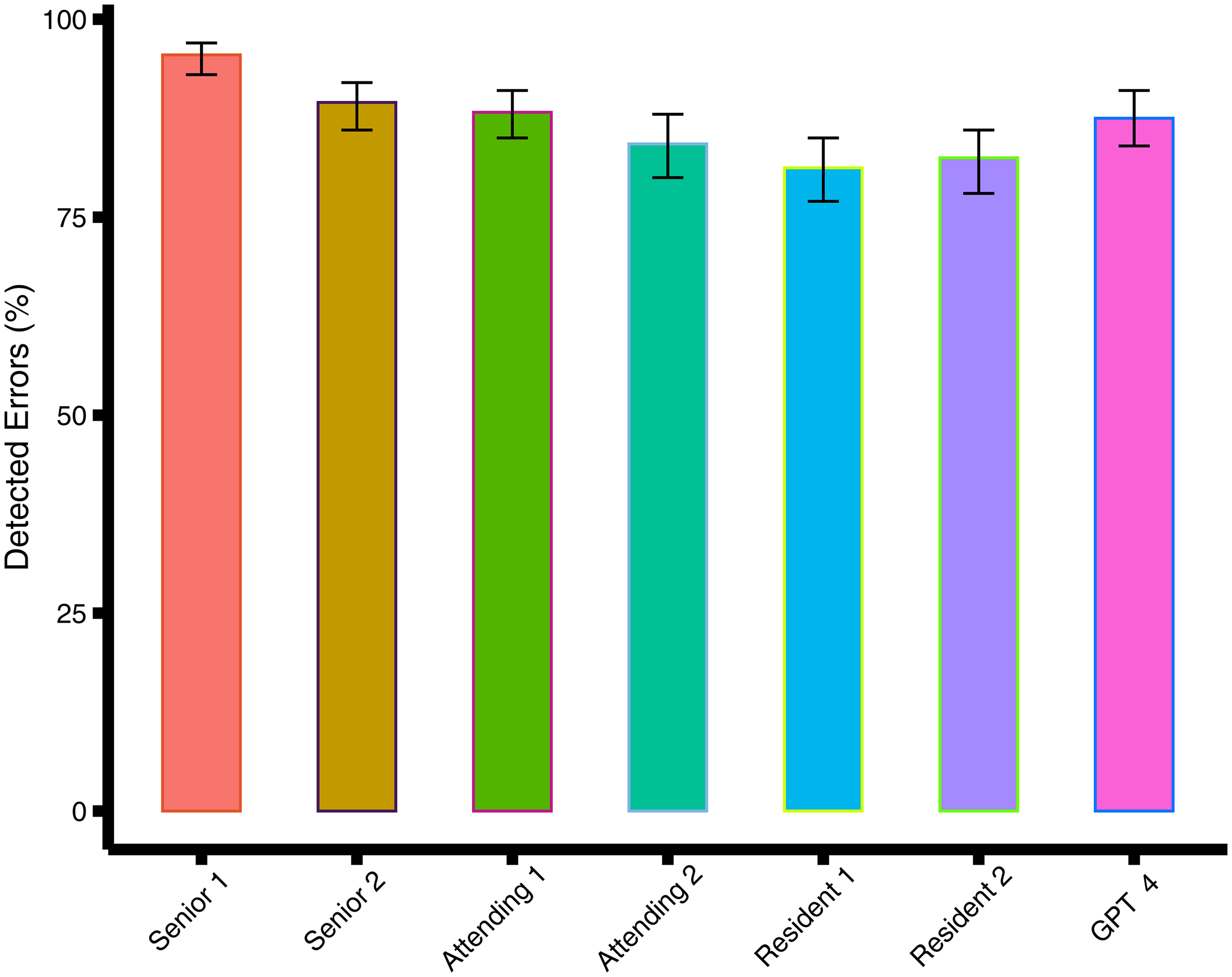 Bar graph shows the percentage of detected errors for GPT-4 and the doctors. The error bars are 95% CIs.