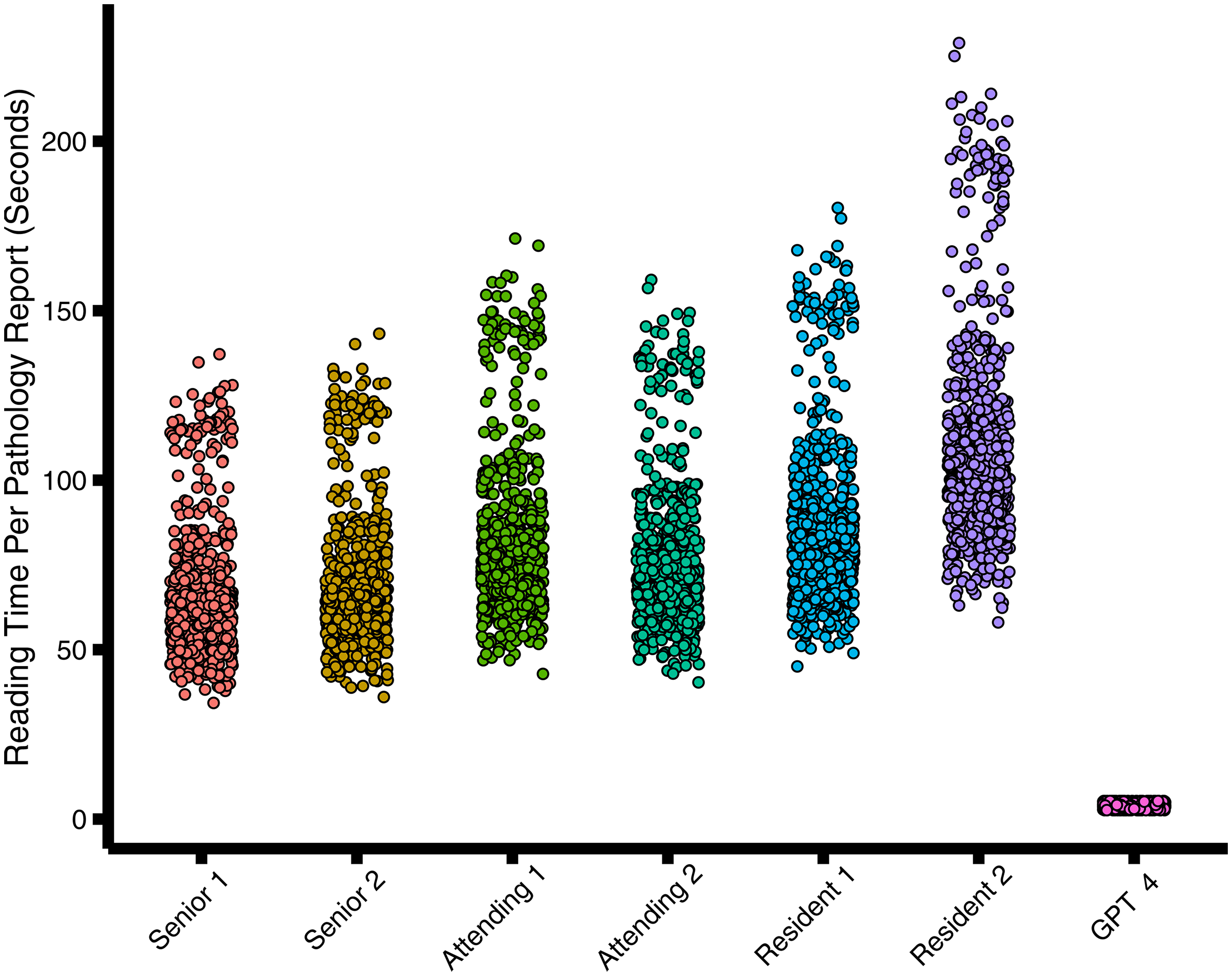 The aggregate reading time for all 700 reports by GPT-4 amounted to 0.78 h. In contrast, the swiftest pathologist completed the review of 700 reports in 12.76 h, while the slowest pathologist took 21.35 h (Figure 3 and Table 7). The mean reading time per pathology report for GPT-4 was significantly shorter compared to the fastest pathologist (mean reading time, 4.03 seconds ± 0.8 [SD] versus 65.64 seconds ± 18.63;