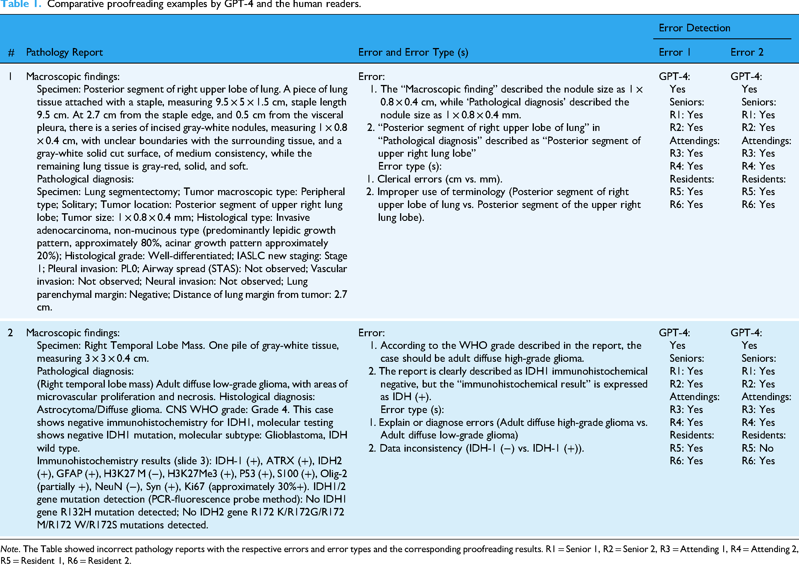 These categories were defined to capture the most common and clinically significant types of errors that occur in pathology reports. To ensure clarity and consistency, these error categories were consistently referenced throughout the study, with specific examples provided to enhance understanding. The role of the senior pathology expert was crucial in both the introduction and categorization of these errors to ensure they accurately represented realistic challenges faced in pathology reporting (Table 1).