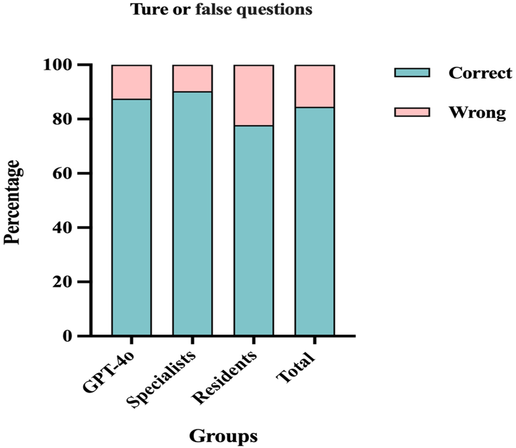 Percentage of correct and wrong answers for the true or false questions among GPT-4o, specialists, and residents.