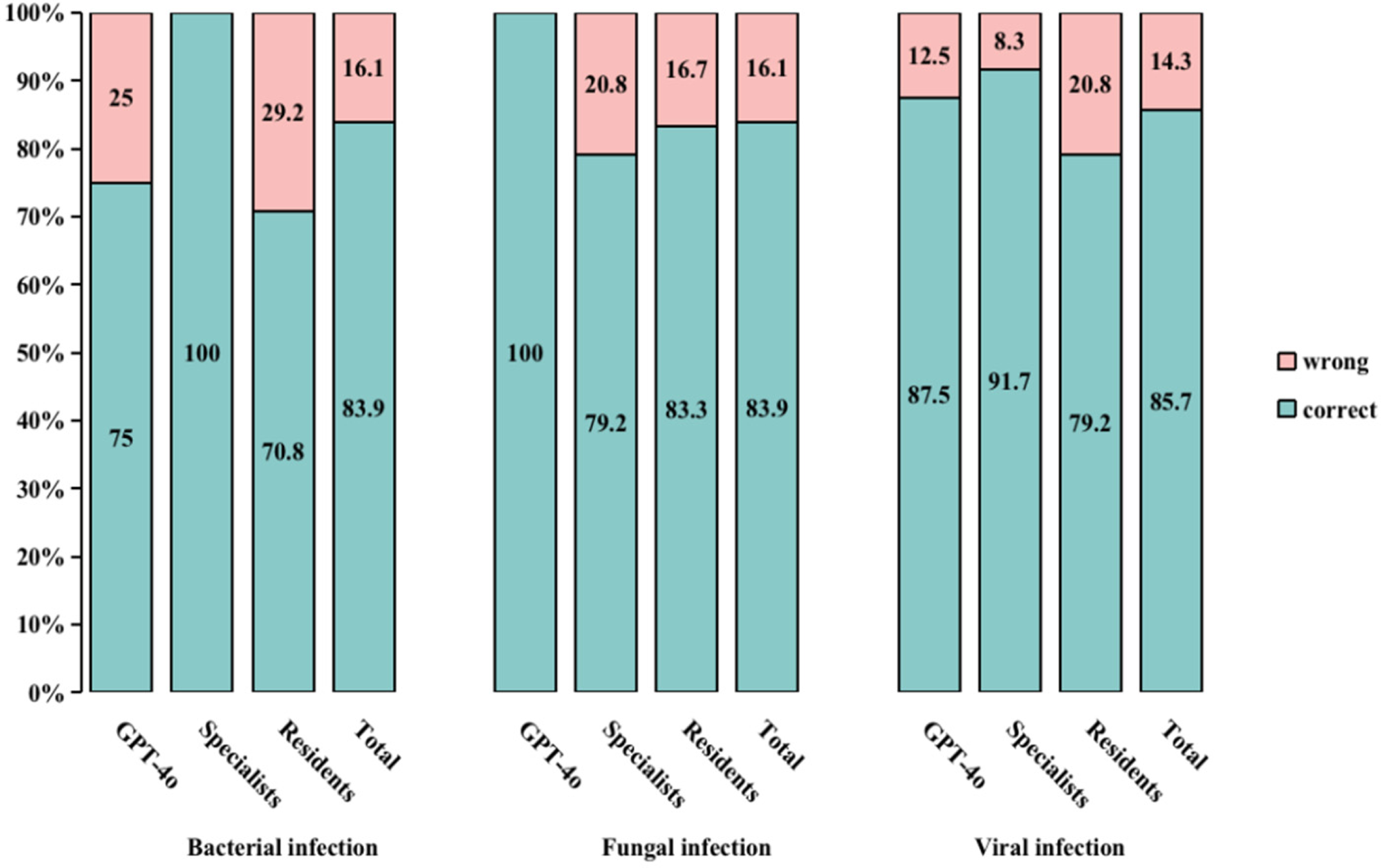 Notably, there were no significant differences in the accuracy of responses across the different types of infections: bacterial, fungal, and viral (Supplementary Material 3 - Table S1). However, specialists achieved a higher percentage of correct answers for bacterial infections (100%) compared to GPT-4o (75.0%) and residents (70.8%) (