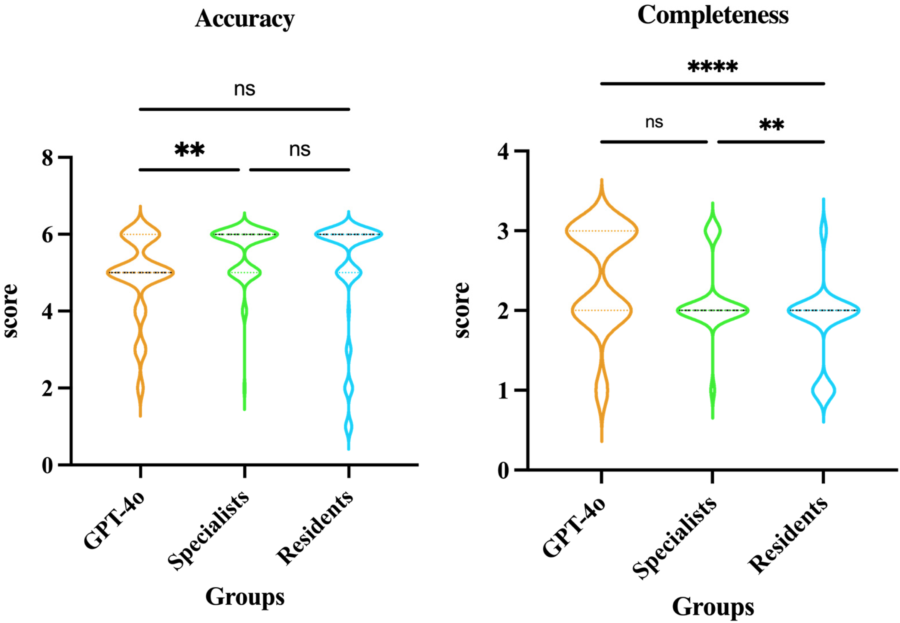 Violin plots (Figure 4) further illustrate these group differences. For accuracy, specialists consistently achieved significantly higher scores compared to both GPT-4o (