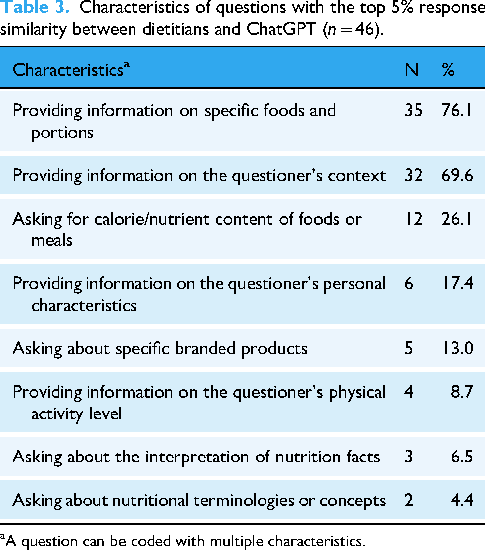 Characteristics of 46 questions that had the top 5% response similarity between dietitians and ChatGPT are presented in Table 3. Most questions with high response similarity included detailed information. For example, questions included information on specific food items or portions (76.1%), the questioner's context (69.6%), or personal characteristics (17.4%). A good example of a question that ChatGPT provided a response highly similar to that of a dietitian is one from a 27-year-old woman. She provided detailed information about her basal metabolic rate, anthropometric measurements, and usual eating pattern: My basal metabolic rate is usually around 1400 kcal, and on days when I work out, it's around 2500 kcal. I'm 27 years old, 168 cm/69 kg. I'm trying to lose weight and get down to my ideal weight of 62 kg, so I’ve been eating less. I usually eat about half of a regular meal for lunch, eggs and bananas for dinner, and no snacks at all! I feel like I’m eating less than 1400 kcal a day, so I have some questions about that!