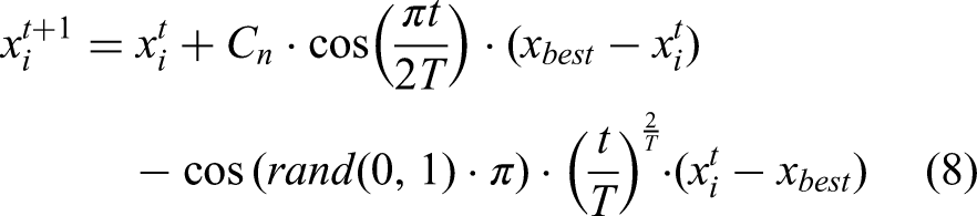 In MSPO's communicating behavior, parrots exhibit dual flight modes: collective flocking toward group communication or individual solitary flight. Assuming equiprobable selection between these behavioral modes. The position update mechanism is formally expressed by equation (7):