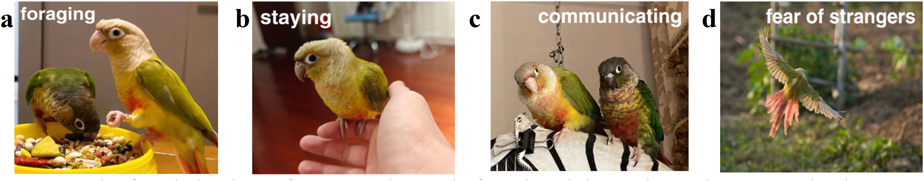 The four behaviors of parrots where a is foraging, b is staying, c is communicating, and d is fear of strangers.