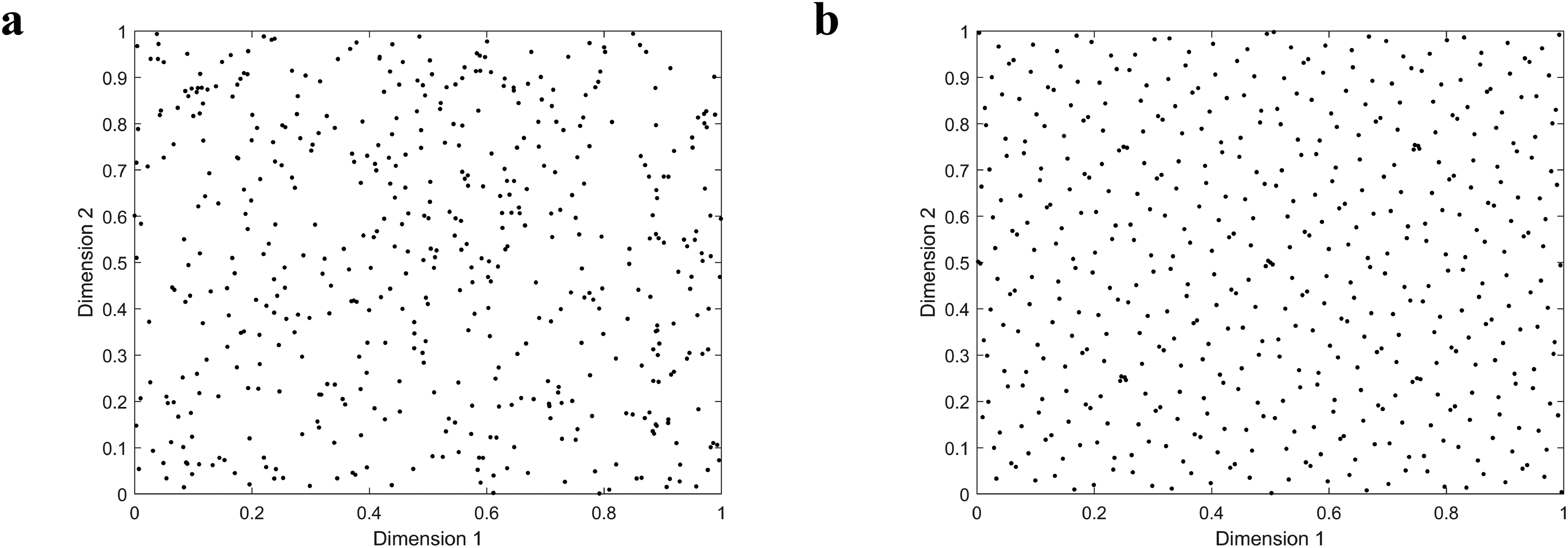 Distribution of the population under distinct initialization schemes where a is scatterplot of population distribution with random initialization, and b is scatterplot of population distribution with Sobol sequence initialization.