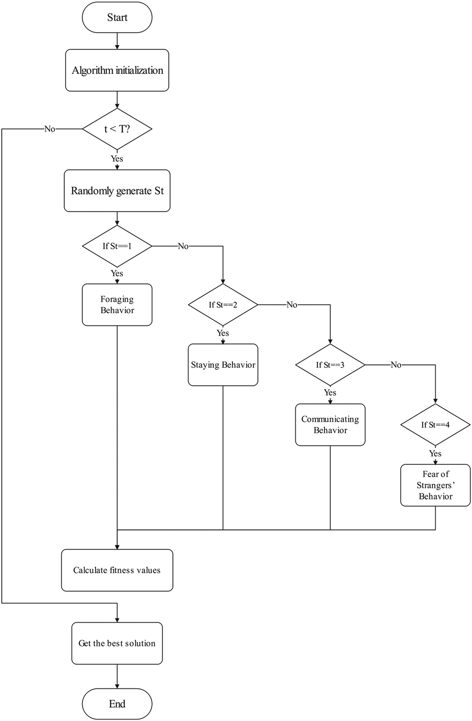 The MSPO flowchart is based on iterative optimization as its core logic (see Figure 6). In the initial phase, algorithm parameters and population initialization are completed, followed by an iterative process. In each iteration, the system first checks whether the maximum number of iterations has been reached. If not, it randomly generates behavior identifiers (1–4), corresponding to triggering four behavior patterns: foraging, resting, communication, and stranger fear, and updates the individual's position according to their respective formulas. After updating the positions, the fitness values are calculated, and the global optimal solution is updated accordingly. This process repeats until the termination conditions are met, ultimately outputting the optimal solution. This process achieves efficient exploration and optimization of the solution space through the coordinated use of multiple behavioral strategies.