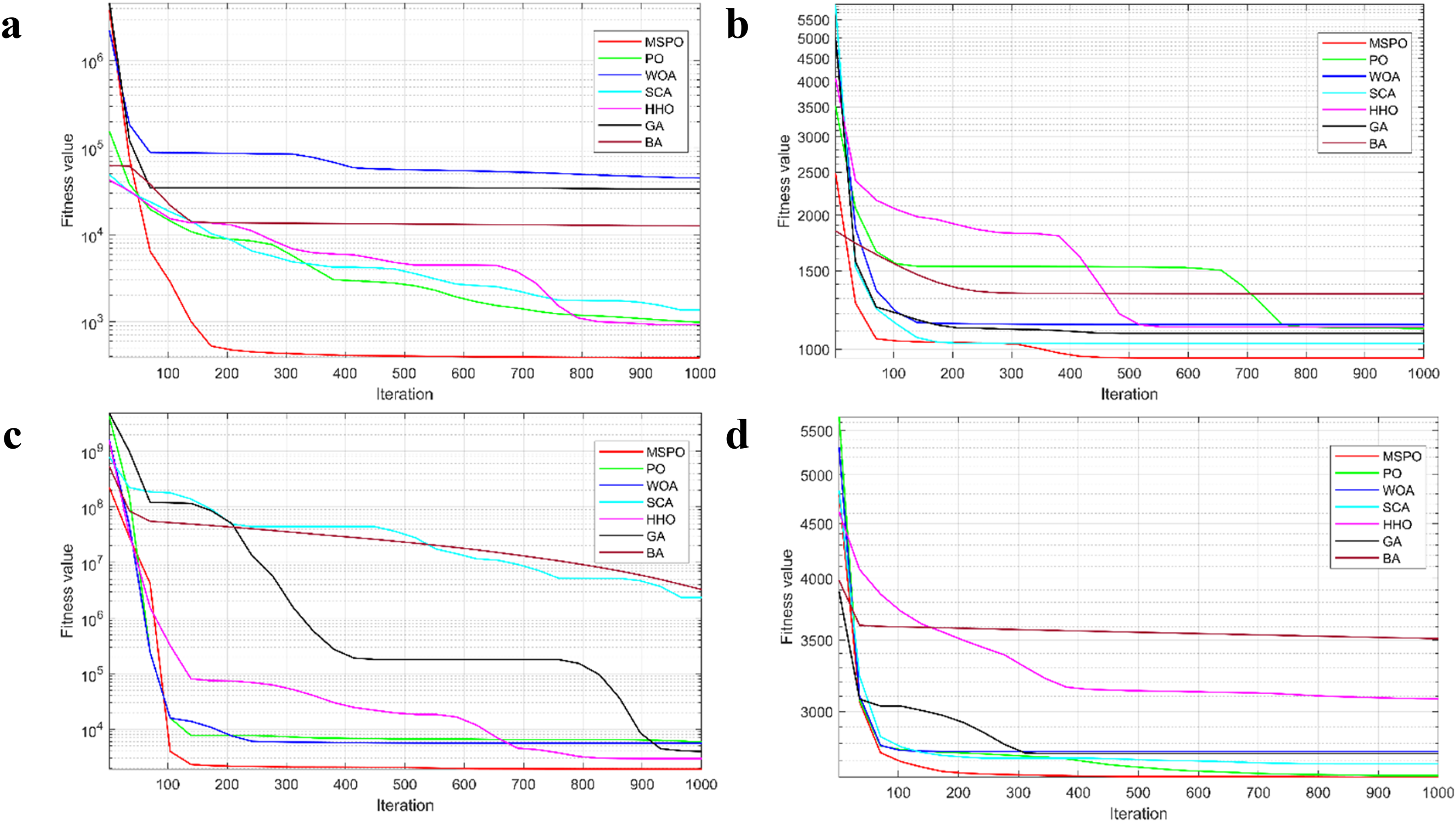 On the F1 function, MSPO exhibits a rapid decline in the initial phase, completing the main performance improvement within only the first 200 iterations, and then continuing to approach the global optimum at a steady rate. In contrast, the remaining algorithms exhibit some degree of fluctuation in early searches. For the multimodal function F5, MSPO still maintains an efficient descent trend and shows more stability in the middle and late iterations. PO and SCA have significantly higher final convergence values than MSPO despite their initial descent ability. F6 is a hybrid function, which usually puts a higher demand on the optimization algorithm's global search and its dynamic local optima avoidance. From the figure, it can be observed that MSPO not only starts descending faster compared to other algorithms but also continues to search deeper into the search space and finally obtain the lowest function value. In contrast, SCA and BA stagnate after converging to the local optimum and are difficult to optimize further. When facing the more challenging combinatorial function F11, the advantage of MSPO is again demonstrated. Its convergence path is smooth and continues to approach the optimal region, which is much better than the performance of most of the compared algorithms.