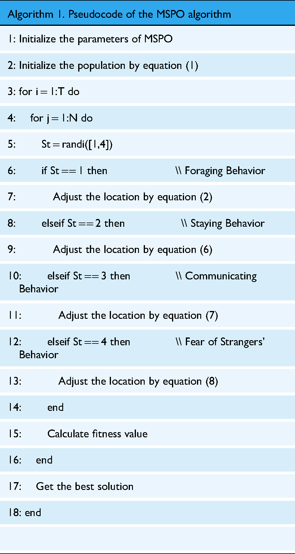 Algorithm 1 outlines the pseudocode of MSPO. The procedure begins with initializing all algorithm parameters and the population. Subsequently, MSPO employs the four parrot behaviors to search for approximate solutions. Throughout the optimization procedure, every individual iteratively updates its position until reaching the maximum iteration count.