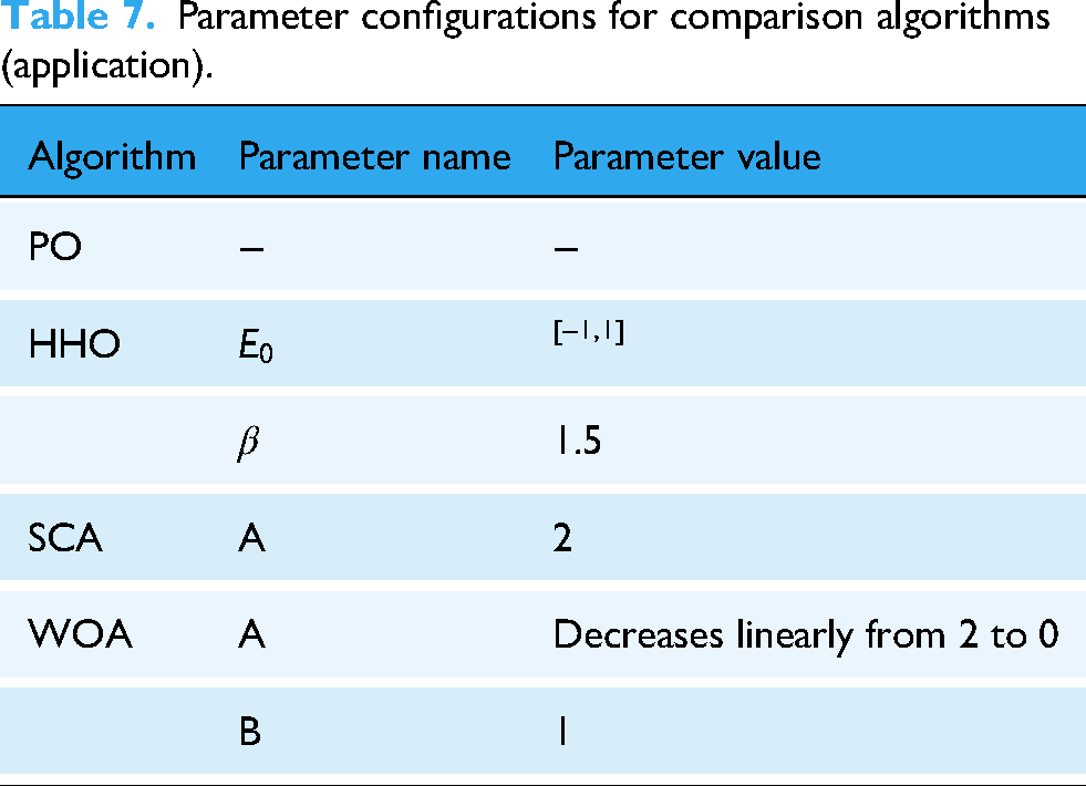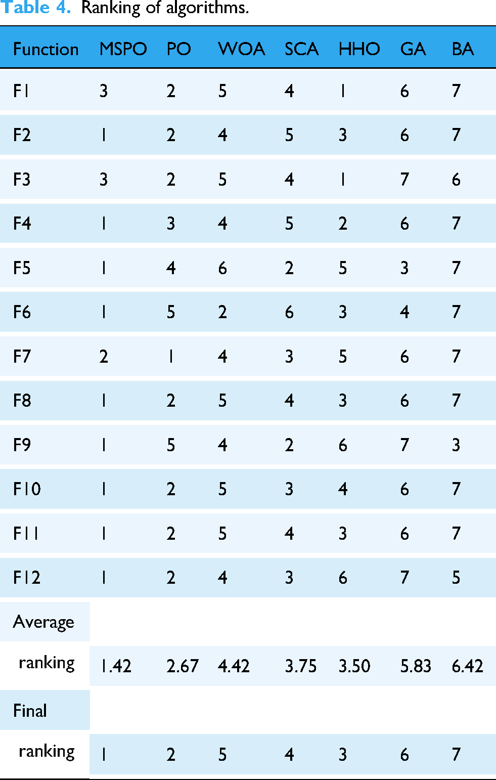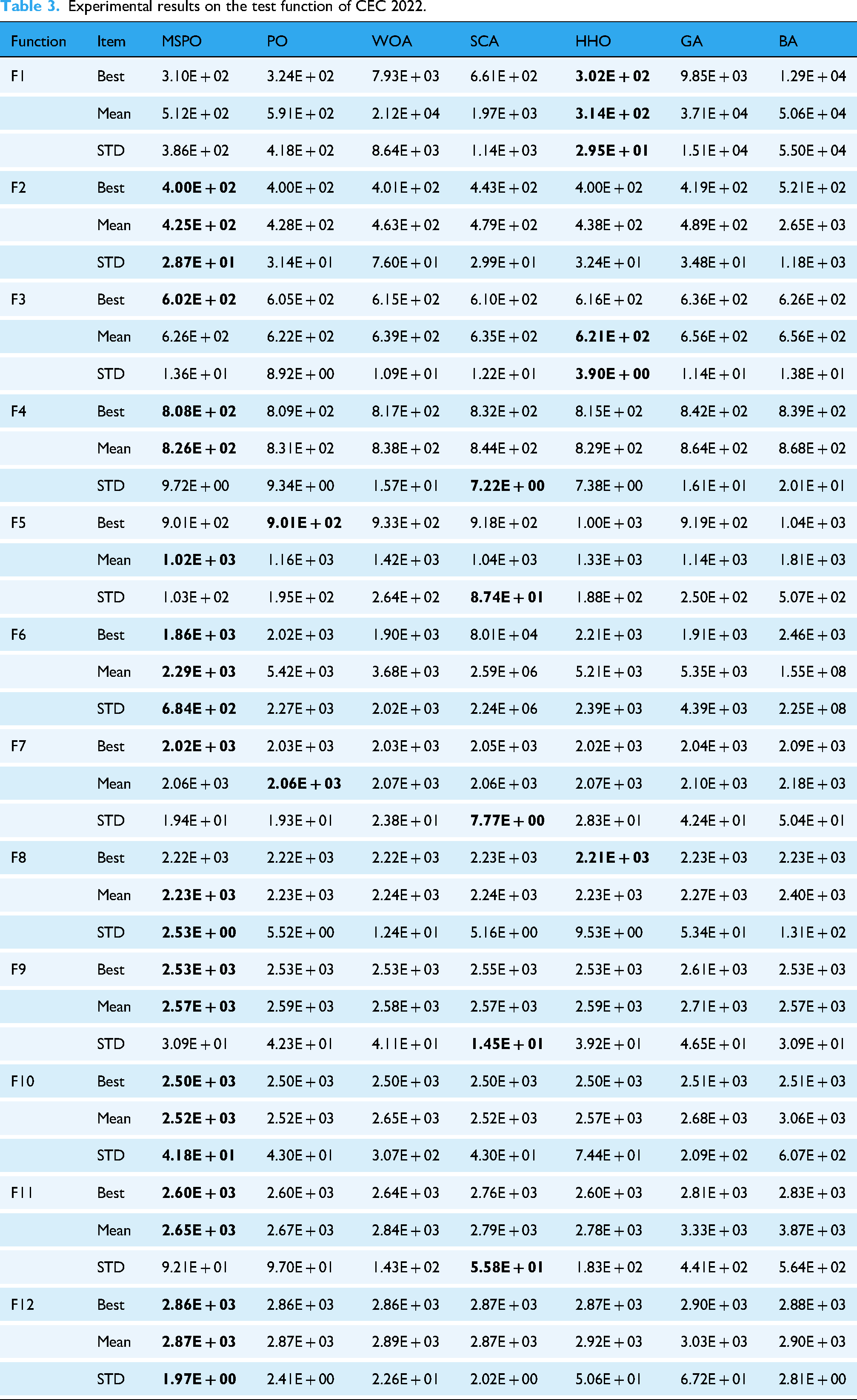 In addition, to validate the validity of MSPO, it was evaluated against six other well-known algorithms. These algorithms include Parrot Optimizer (PO), 38 Whale Optimization Algorithm (WOA), 39 Sine Cosine Algorithm (SCA), 40 Harris Hawks Optimization (HHO), 41 Genetic Algorithm (GA), 42 and Bat Algorithm (BA). 43 Table 2 provides specific information about these algorithms, including the values of the algorithm parameters.