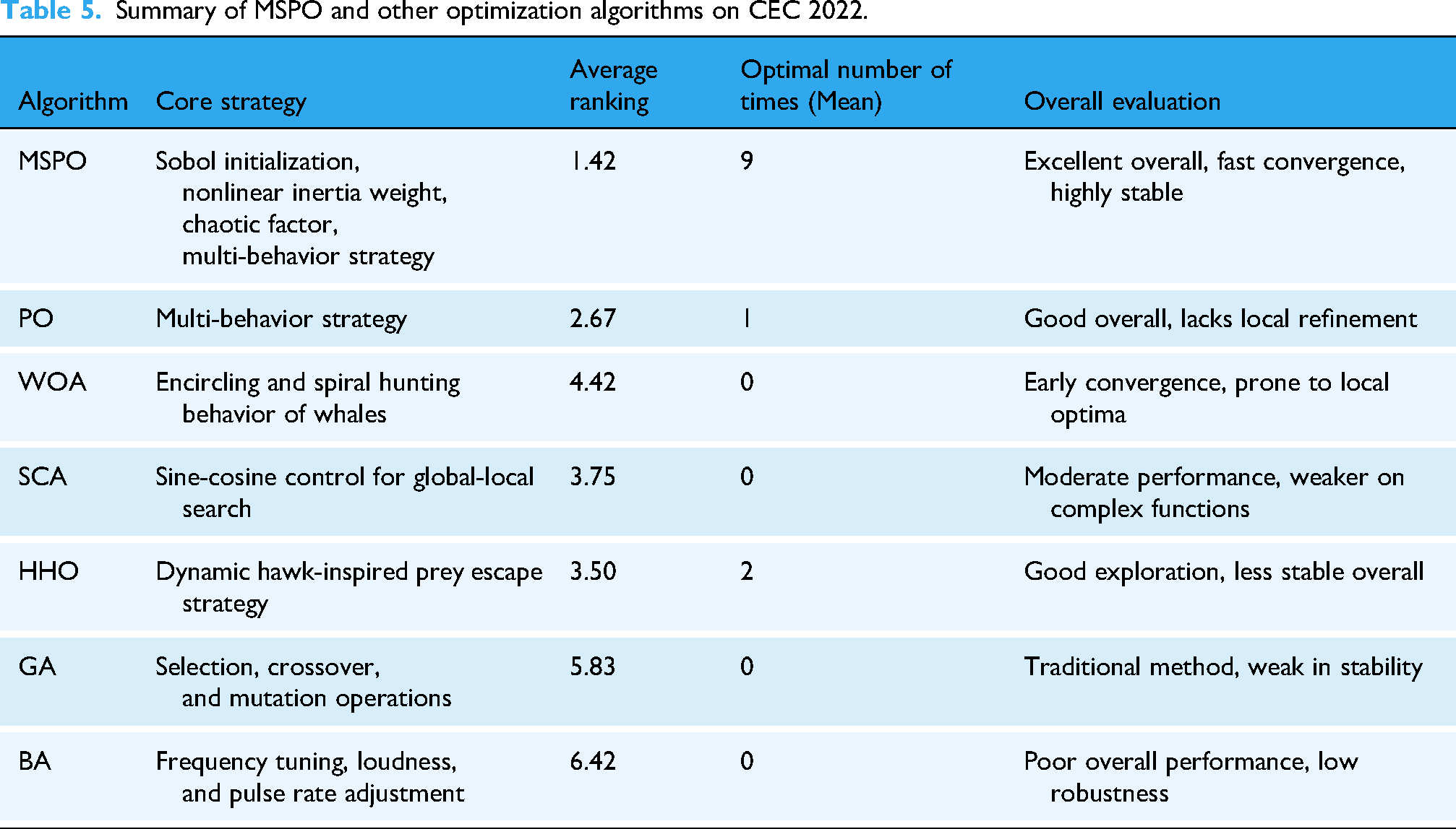 Table 5 summarizes the comprehensive performance comparison of the MSPO algorithm proposed in this paper with mainstream optimization algorithms such as PO, WOA, SCA, and HHO on the CEC 2022 benchmark functions. In terms of metrics such as average ranking and optimal number of iterations, MSPO achieved the optimal average ranking of 1.42 in 12 test functions and ranked first in 9 functions, comprehensively outperforming other comparison algorithms, thereby validating its strong global search capability and stability.
