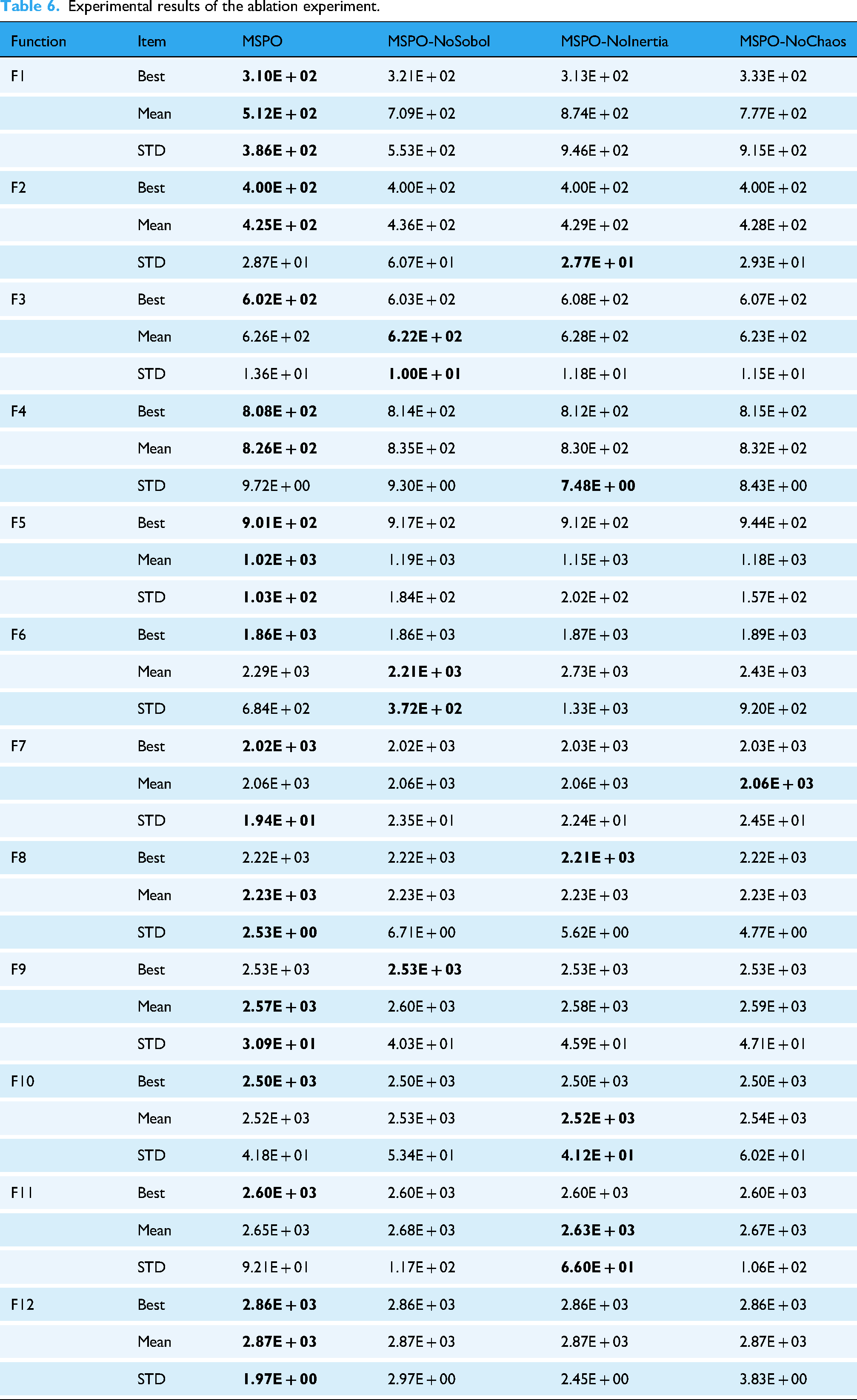 Table 6 presents the performance statistics of MSPO and its three variants on CEC 2022.