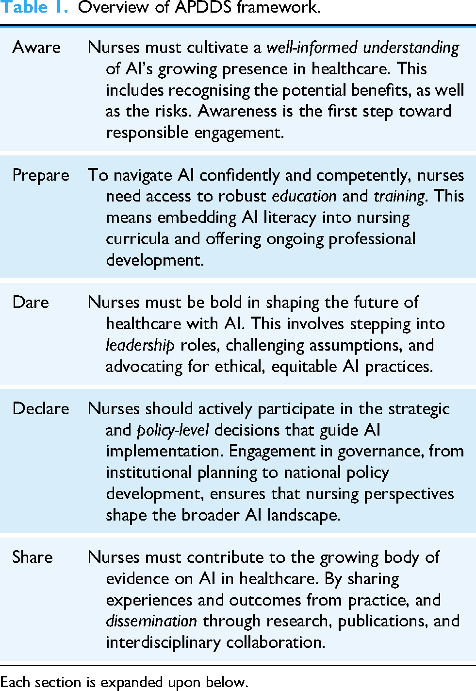 This framework provides a structured approach for understanding and operationalising nursing's role in an AI-enabled future. Figure 1 illustrates the APDDS framework as a circular model, emphasising the dynamic and iterative nature of nurse engagement with AI. Each component: Aware, Prepare, Dare, Declare, Share, builds upon and reinforces the others, reflecting the continuous cycle of learning, leadership, and advocacy required to integrate AI meaningfully into nursing practice. Each component highlights a key area of focus (Table 1) to ensure nurses are not only prepared for this transformation but are also leading it.
