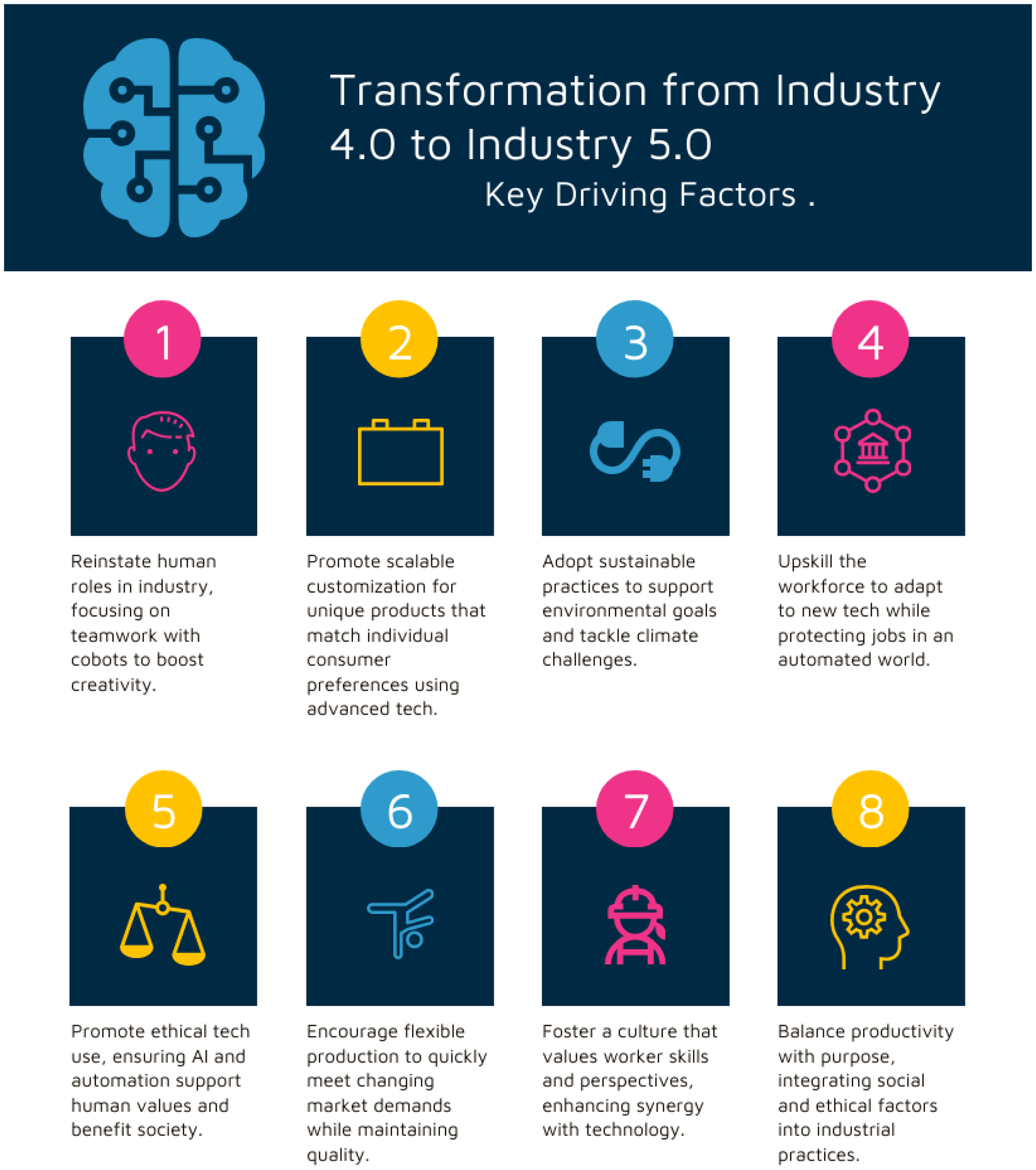 Meanwhile, Industry 5.0 (IR 5.0) emerged as an extension to IR 4.0, incorporating social and environmental dimensions. IR 5.0 emphasizes worker skills, knowledge, and their ability to collaborate with robots and machines while focusing on flexibility in the production process and minimizing environmental impact.5,6 IR 5.0 reinforces the co-existence of humans and machines, ensuring automation support for human creativity and customization. 7 Human positioned as partners to machine, focusing on personalization and problem-solving. The key technologies of IR 5.0 are collaborative robots, AI-driven personal assistance, customization-focused systems and techniques enabling sustainability and green technologies.8,9 It is represented by concepts such as sustainability, human-centric values, quality of life enhancement, and mass personalization. 10