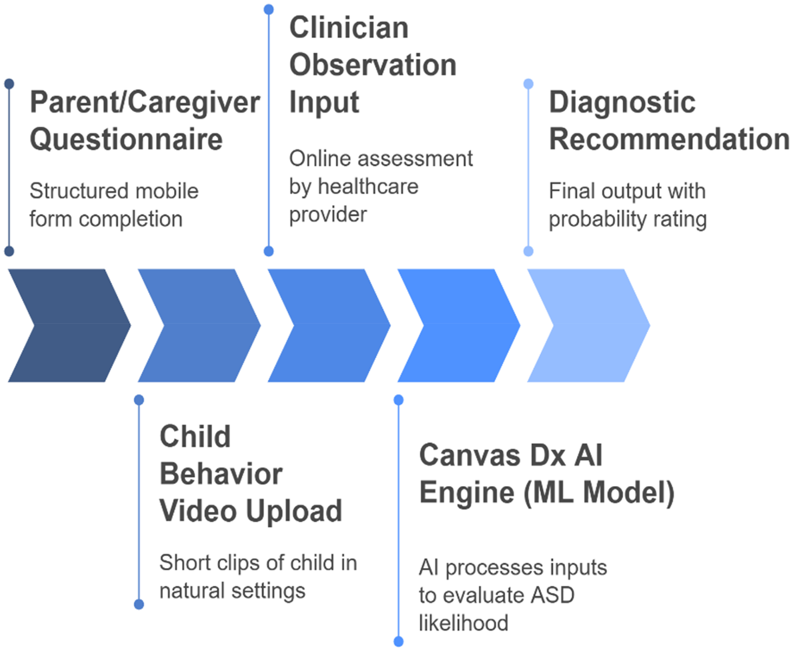 Diagnostic process flow of Canvas Dx for early autism detection using AI, clinician input, and behavioral data.