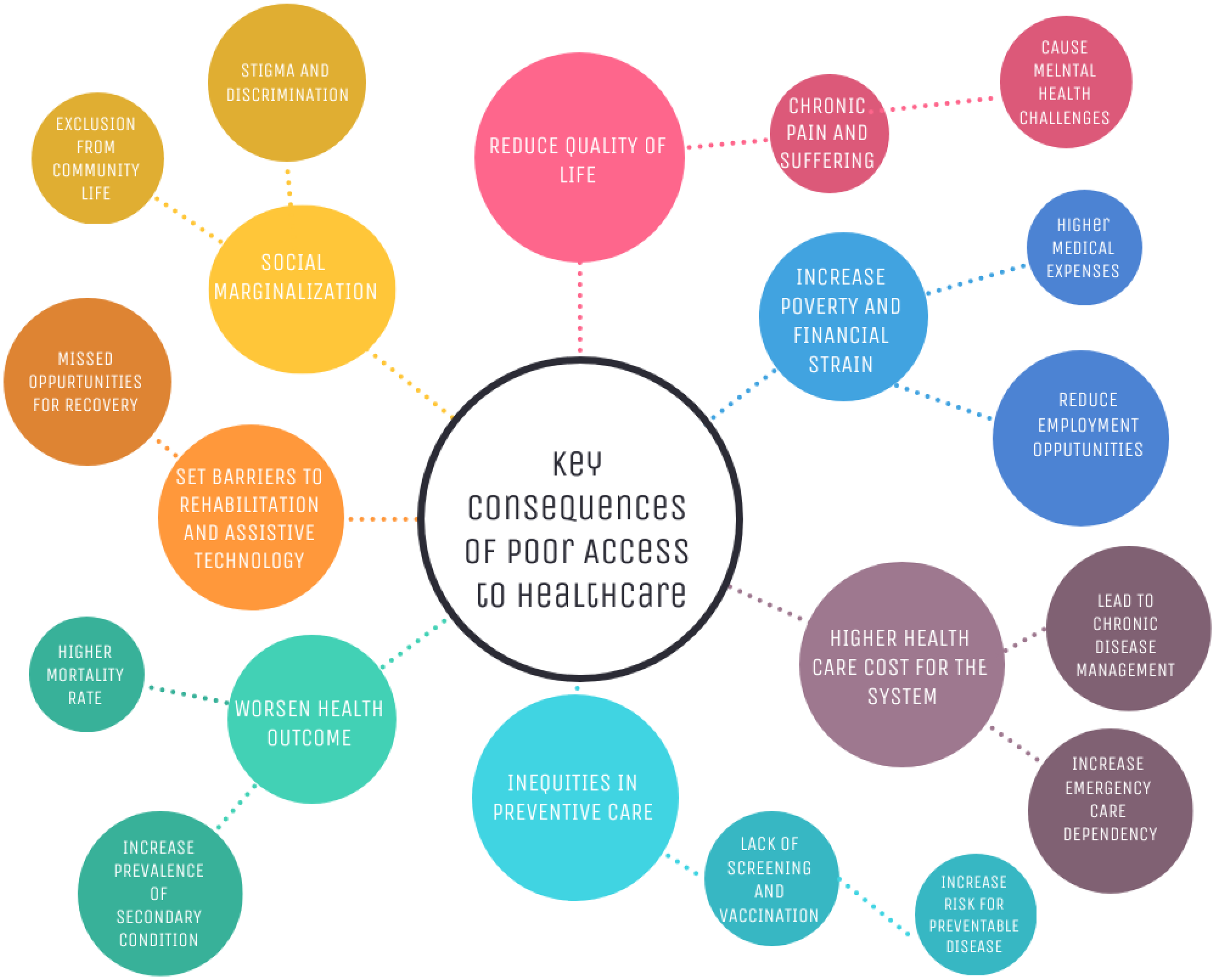 Access to healthcare is essential for achieving good health and is recognized as a fundamental human right. An inclusive healthcare system for people with disabilities is essential to ensure equitable access to medical services, improve health outcomes, and promote dignity and social justice. It is estimated by the World Health Organization (WHO) that around one billion people globally live with a disability, with approximately 80% residing in low and middle-income countries. 15 Studies have shown that people with disabilities, whether in high-income countries or low- and middle-income countries, are more likely to have poorer health outcomes compared to those without disabilities. 16 Disabilities can be physical, sensory, intellectual, or mental health related. The World Health Survey estimates that the prevalence of disability is 60% higher among women compared to men. 17 Poor access to healthcare for people with disabilities has a far-reaching impact on their health, well-being, and social participation. The key consequences of poor access to healthcare are presented in Figure 2. The United Nations International Children Emergency Fund (UNICET) reported that children with disabilities account for approximately 150 million. These children have less access to the healthcare system due to few reasons, such as personal and community beliefs, lack of awareness of disability, unavailability of health services, complicated clinical pathways, and absence of qualified health professionals.18–20
