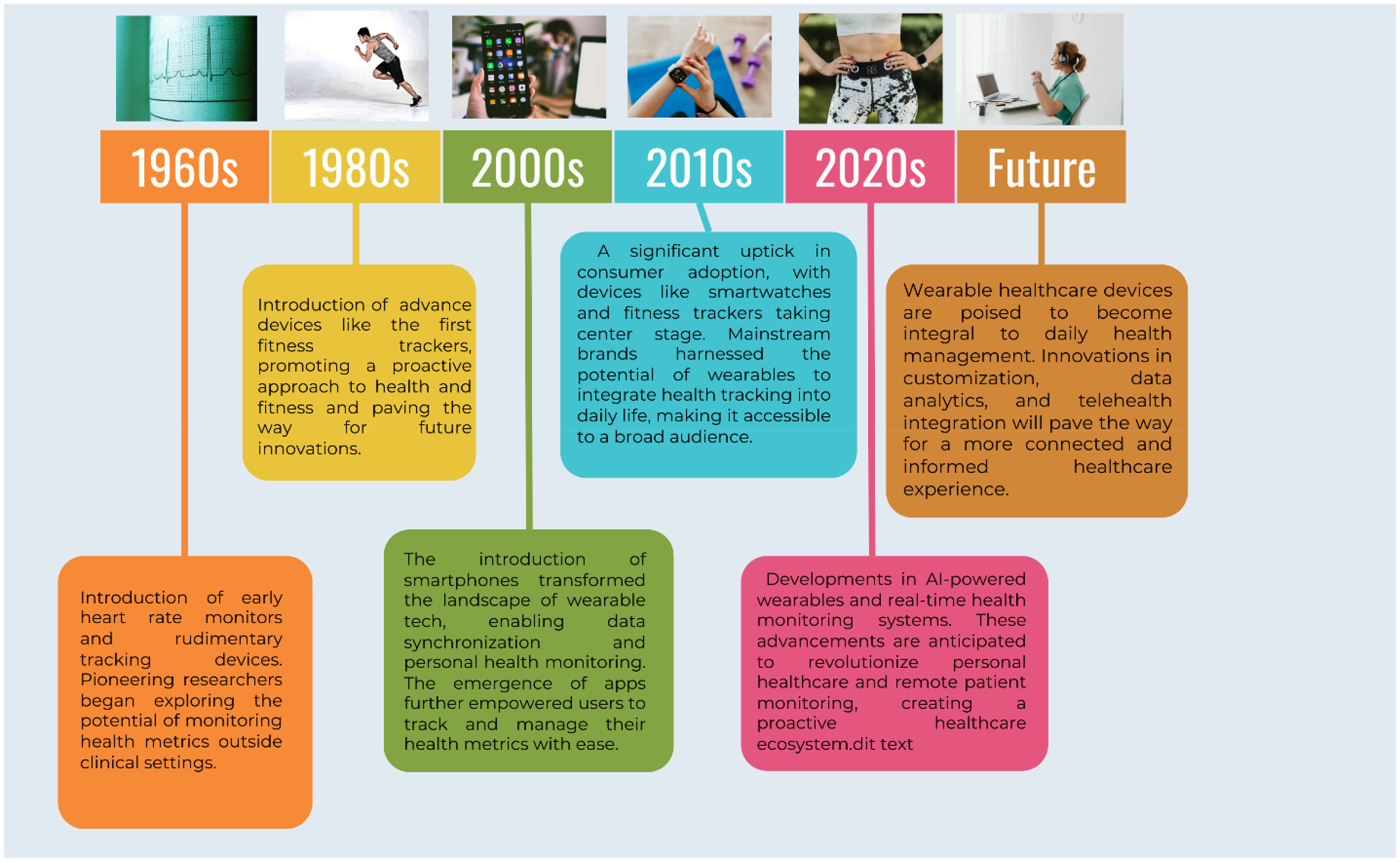 The early stages of wearable health device development were noted between the 1960s and 1990s, with the development of basic heart rate monitors and portable ECGs. The technology bloomed around 2014 with the introduction of fitness trackers and smartwatches. 58 In 2020, 19% of Americans utilized wearable fitness trackers.59,60 At the same time, between 2005 and 2010, smart inhalers and other connected devices for asthma monitoring gained popularity in terms of usage among consumers. In 2012, Propeller Health introduced a smart inhaler device, which uses a sensor to monitor the frequency of inhaler use and record the data in mobile apps. 61 The development of wearable device technology in healthcare is shown in Figure 6.