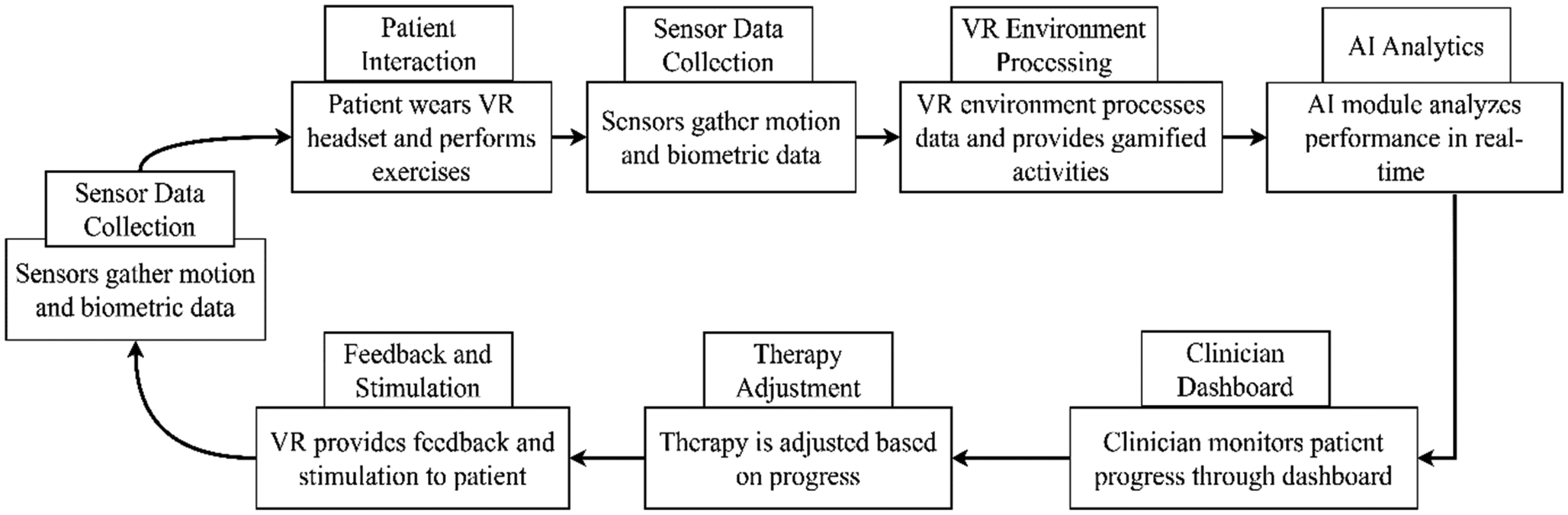 Workflow of XRHealth’s VR-based closed-loop rehabilitation system integrating AI and clinician feedback.