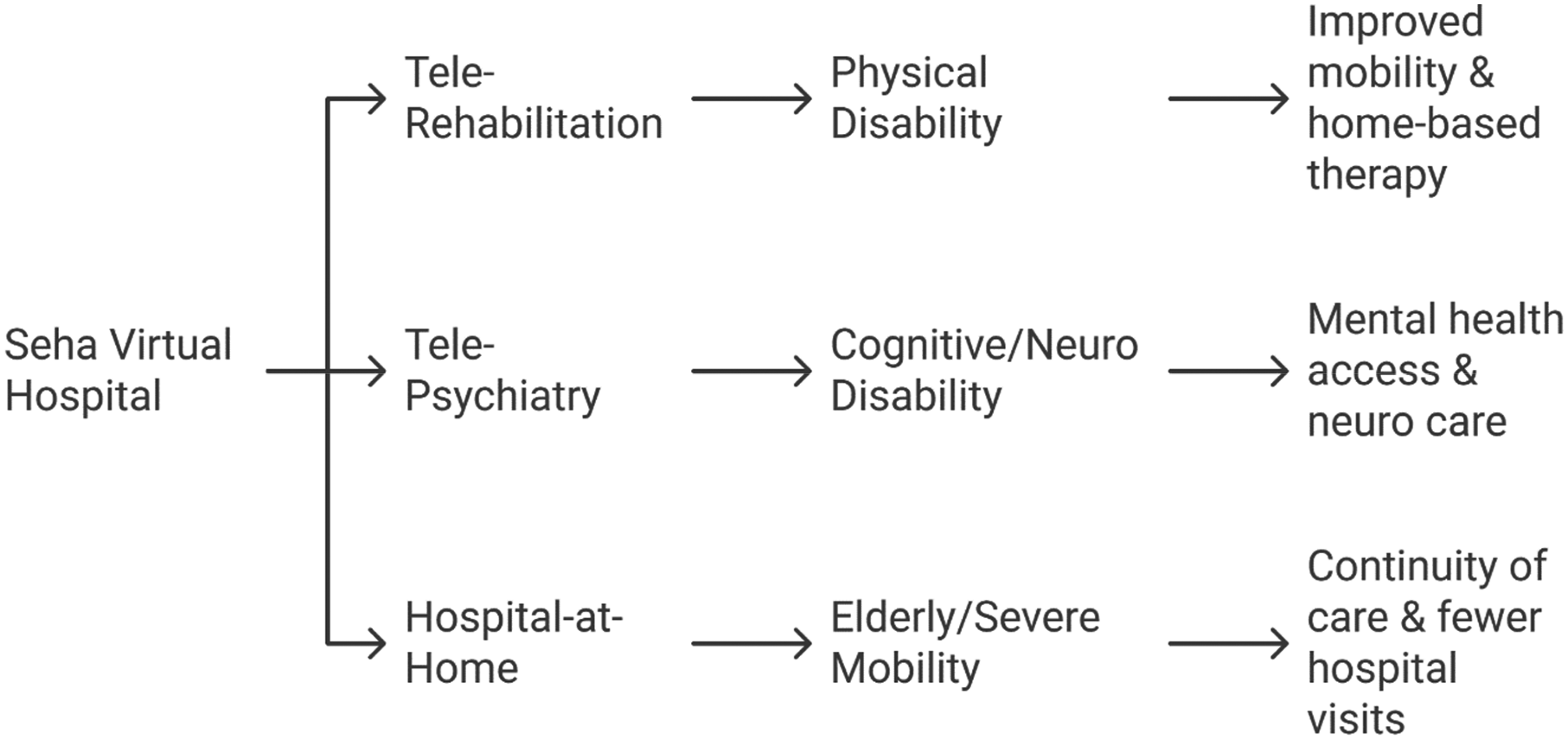 Mapping Seha Virtual Hospital's telehealth services to specific disability types and inclusive outcomes.