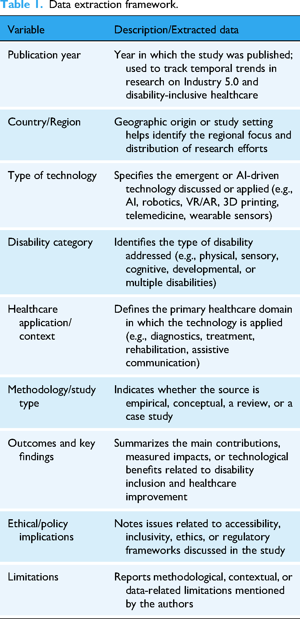 This study adopted a scoping review design, following the framework proposed by Arksey and O’Malley 14 and enhanced by the Joanna Briggs Institute (JBI) for scoping reviews. The scoping approach was selected as it allows the mapping of a broad, interdisciplinary entity that spans emerging technologies, disability inclusion, and healthcare transformation under the IR 5.0 paradigm, fields and topics that are conceptually diverse and complex, and methodologically heterogeneous and multiscale. The review was conducted in alignment with the PRISMA-ScR guidelines to ensure transparency and reproducibility. A formal protocol was developed internally by the research team and applied throughout the research work. However, given the exploratory nature of the topic, it was not registered in PROSPERO, which primarily indexes systematic reviews of clinical interventions. The flow process was conducted in PubMed, Scopus, Web of Science, and IEEE Xplore databases in December 2024. The search combined key terms and Boolean operators as follows: (Industry 5.0 or Human Centric Industry) and (Artificial Intelligence or AI) and (disability or Disability Inclusion or Assistive Technology) and (healthcare or Digital Health or Diagnostics or rehabilitation). Reference lists of key papers as well as relevant reviews were also screened to identify and confirm additional sources. The search was limited to English language publications, from 2015 to 2024, to concentrate on contemporary development in IR 5.0 and emergent digital health technologies. The studies were included when they covering the following criteria: (i) discussed or applied IR 5.0 related technologies (AI, robotics, VR, AR, etc.) in the context of disability-inclusive healthcare, (ii) presented case studies, reviews, empirical investigation, or conceptual frameworks related to the global topic (inclusion, accessibility, or human centric healthcare design), (iii) published in peer-reviewed journals or confirmed conference proceedings. When the studies were focused solely on IR 4.0 or general digital transformation without a healthcare or disability focus, or the source of the information was from non-peer-reviewed materials (opinion pieces, editorial, etc.), the references were excluded. The data extraction framework is detailed in Table 1, in which the different information discussed and evaluated by our teams and other benevolent experts are summarized, such as publication year, country, type of technology, disability category, healthcare application, outcomes, challenges, and limitations. Collected available data were then synthesized narratively and thematically to identify recurring patterns, conceptual gaps across studies, technological trends, and the degree of evolution and incorporation of the characteristics of IR 5.0 in the different healthcare ecosystems. The screening and selection process followed PRISMA-ScR guidelines and is reflected and summarized in the results narrative, indicating the total number of the identified, screened, excluded, and finally retained records for full analysis. Five analytics themes were addressed: (i) the importance of disability inclusion in healthcare, (ii) types and impact of disabilities, (iii) emergent technologies and diagnostics, (iv) role of AI in disability diagnostics and care approaches and strategies, and (v) illustrative case studies and success stories. In front of some limitations such as the heterogeneity of study designs and outcomes measures, and absence of standardized quality appraisal tools, several measures were adapted and well applied: (i) a multi-stage screening and review consensus process to enhance reliability in study selection, (ii) refinement of search terms in collaboration with subject experts in the related field and topic, (iii) inclusion of both conceptual and empirical evidence, recognizing the emergent nature of IR 5.0 and its applications to inclusive healthcare.
