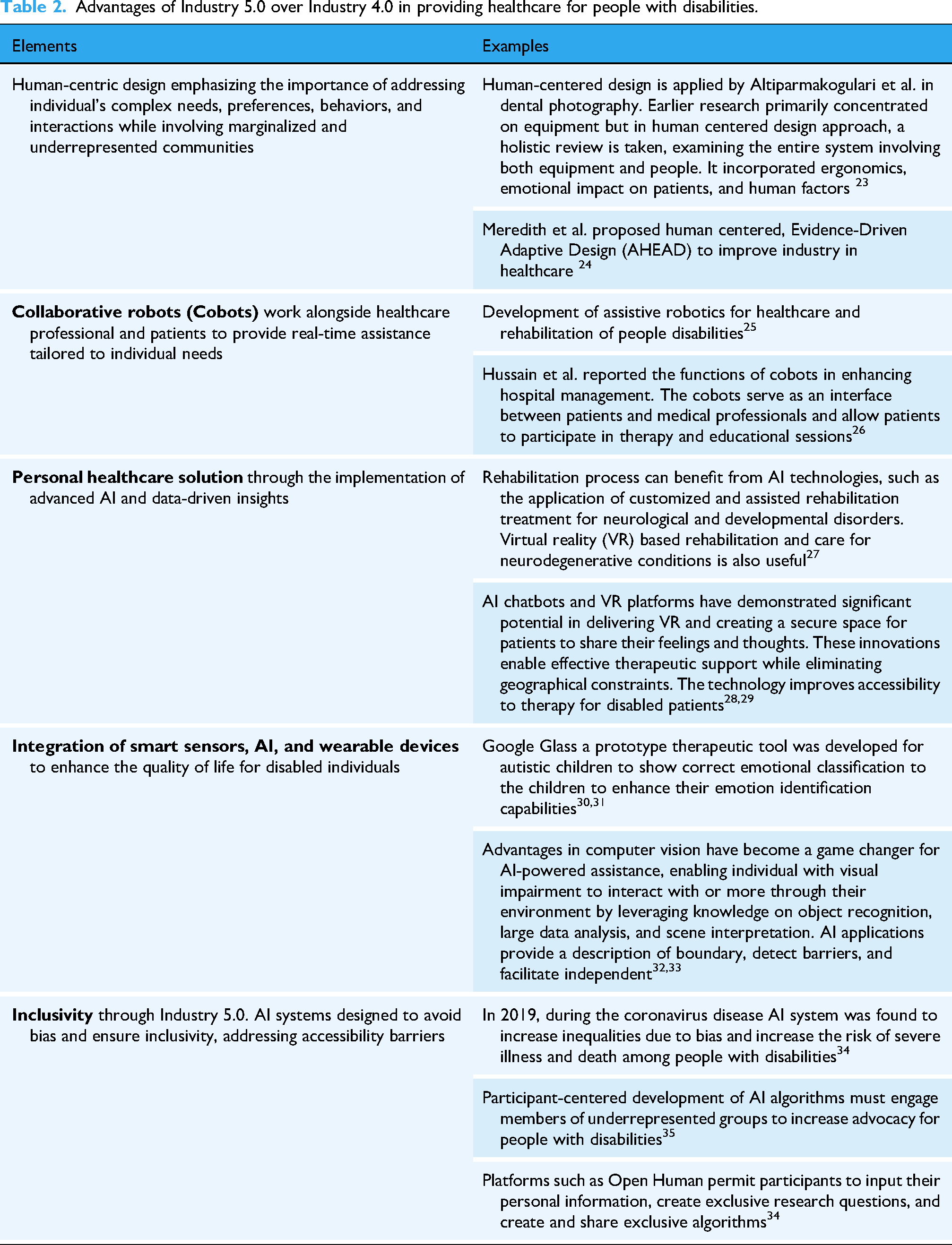 IR 4.0 technologies have significantly enhanced the inclusiveness of the healthcare system for people with disabilities by addressing barriers, improving accessibility, and enabling personal care. Advanced data analysis for personalized care can analyze health records and behavior patterns to design personalized treatment plans for individuals with disabilities. However, existing personalized healthcare is tailored to a specific environment, focusing on technological customization through devices and gadgets. They often overlook the complexity of interconnected health conditions, leading to misdiagnosis and compromising both sustainability and long-term health and quality of life for patients. 21 One of the major elements of IR 5.0 is human-centered artificial intelligence (HCAI). Facilitation of human–machine interaction is crucial, and it focuses on designing AI systems that are user-friendly, comprehensible, and accessible, bridging the gap and enhancing the way humans engage with technology. 22 While IR 4.0 relies much on autonomous robotics and efficiency, it often sidelines human aspects. Patients and healthcare workers are treated more as elements of components than as individuals with unique needs. Advantages of Industry 5.0 over Industry 4.0 in providing healthcare for people with disabilities are listed in Table 2.