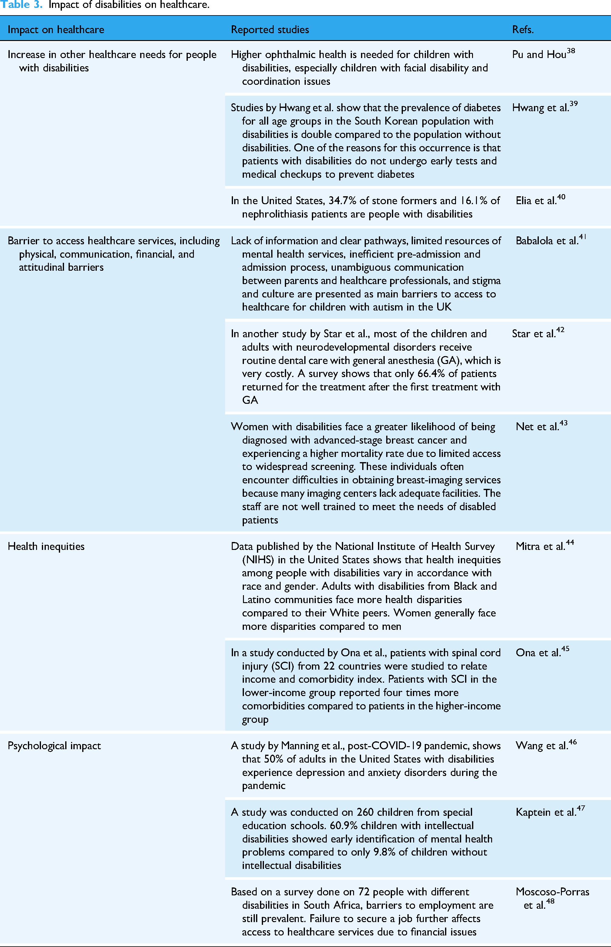 Disabilities are defined as physical, mental, intellectual, or sensory issues that constrain human ability to carry out activities of daily living, participate as a part of the community with meaningful societal roles, or grab opportunities in terms of academic and career. 36 In recent years, patients, especially children with intellectual or sensory disorders, have increased dramatically, which will cause a greater impact on the healthcare system. 37 The categories of disabilities are shown in Figure 3. The impact of disabilities on healthcare, as reported in some previous literature, is listed in Table 3. Individuals with disabilities face numerous barriers when accessing healthcare, as summarized in Figure 4. The impact of the barriers on the disabled patients is shown in Figure 5.