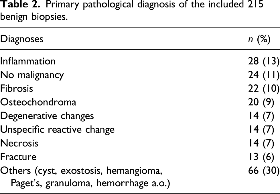 Among the 215 biopsies, the indication was suspected malignancy for 84 (39%), no indication was given for 5 lesions (2%), and a possible benign lesion was specified as an indication for 126 (59%) of the lesions. Removal of benign lesions such as cysts, enchondromas, non-ossifying fibromas, osteochondromas, and osteoid osteomas can be indicated in cases of discomfort, imminent fracture risk, or cosmetic problems, and in connection with removal, samples can be sent for pathological evaluation as well as samples taken in cases of slight uncertainty.