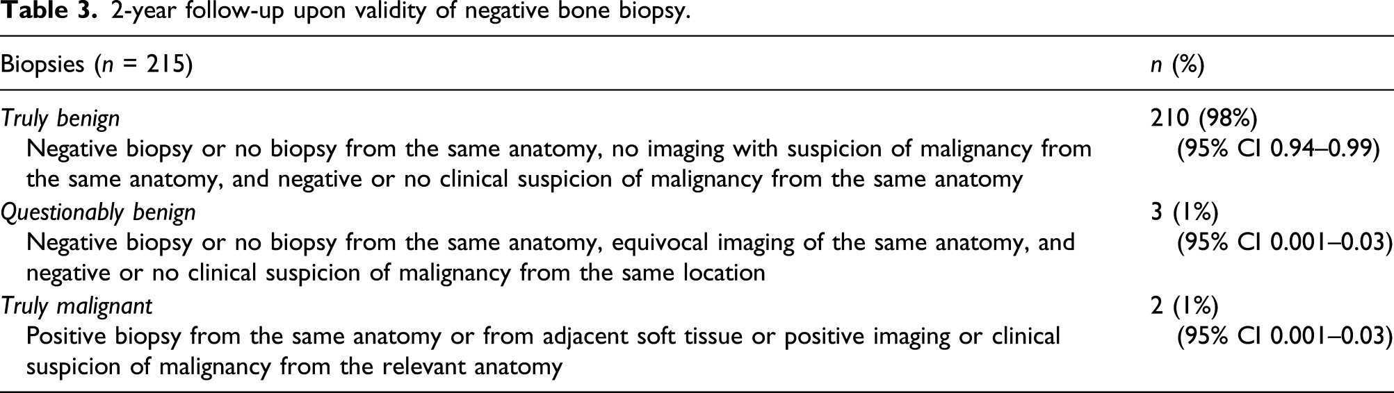A 2-year follow-up for each of the 207 patients representing 215 non-malignant bone biopsies was conducted by two independent readers who reached consensus. The follow-up included a careful computer search on each patient identified by the unique Danish social security number in the pathology database for any additional biopsy, in the imaging system (EasyViz, Karos Health Inc., Waterloo, ON, Canada) for any imaging of the relevant structure, and finally, in the Electronical Patient Journal charts (EPJ - Clinical Suite, CSC Scandihealth A/S) for any relevant journal notes in order to categorize the original biopsy as truly benign, malignant, or equivocal.