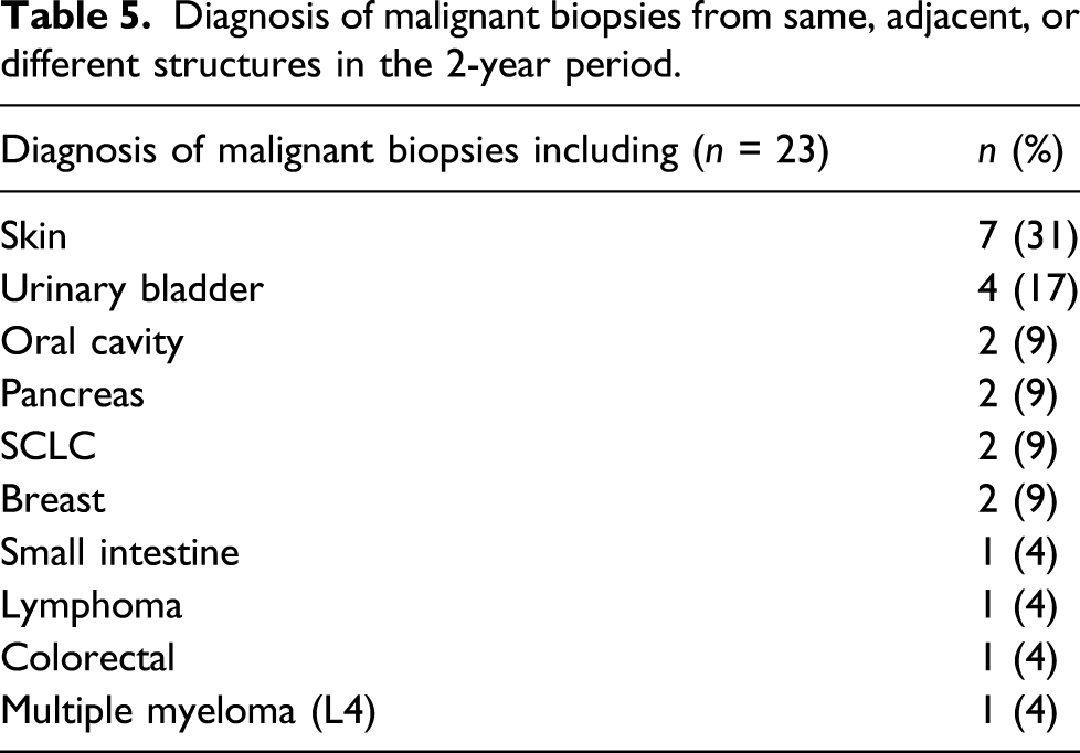 Diagnosis of malignant biopsies from same, adjacent, or different structures in the 2-year period.
