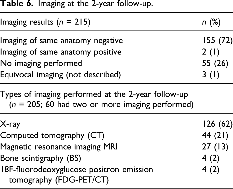 Out of the 59 biopsies taken from 57 patients with prior cancer diagnosis, 9 (15%) did not have any imaging performed in the follow-up period at all. Twenty-one had only one imaging performed, out of which X-ray represented 9 (15%). Twenty-two received 2 different imaging modalities and 7 received 3, meaning that 70% received at least one sensitive diagnostic imaging modality.